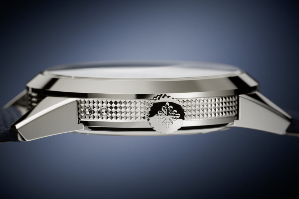 The caseband of the 41mm round case in white gold is decorated with guilloché work in the Clous de Paris or hobnail pattern. This emblematic decoration first entered the Calatrava collection on the bezel of Reference 96D in 1934 and returned to the spotlight in 1985 on the famous Reference 3919, one of the most beautiful symbols of the Patek Philippe style, which remained in production for more than 20 years. A refined detail, the new 5328G-001 features an unusual case construction with the lugs attached to the back, enabling the Clous de Paris decoration to wrap elegantly around the entire caseband. A sapphire-crystal case back affords a private view of the architecture of the new manually wound caliber.