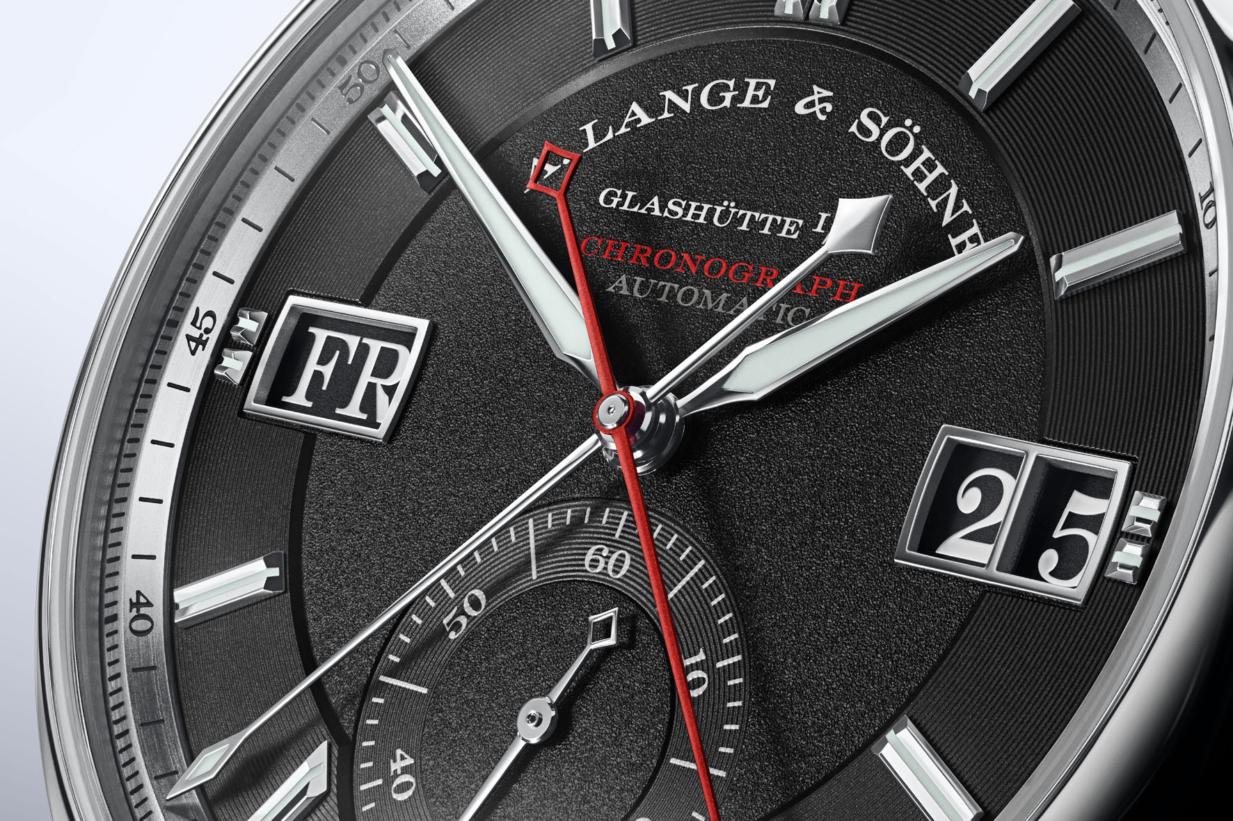 Grazie all’ampliamento dei tempi da 30 a 60 minuti, Lange è riuscita a introdurre nuovi ambiti di applicazione per il cronografo. Esso è dotato di un’innovativa funzione di reset allo zero. Quando si preme il pulsante di azzeramento a ore 4 dopo una misurazione, si assiste a uno spettacolo breve ma impressionante: mentre il contatore dei minuti salta in modo convenzionale alla posizione di partenza, la lancetta rossa dei secondi del cronografo copre l’intera distanza percorsa in precedenza in una frazione di secondo un giro completo per ogni minuto misurato. Se il contatore dei minuti non ha ancora raggiunto la soglia dei 30 minuti, le due lancette si muovono in senso antiorario. Se il contatore dei minuti ha già superato la soglia dei 30 minuti, entrambe le lancette avanzano fino allo zero in senso orario. La lancetta dei secondi effettua di nuovo un giro completo in modo fulmineo per ogni minuto necessario a raggiugere l’ora completa.