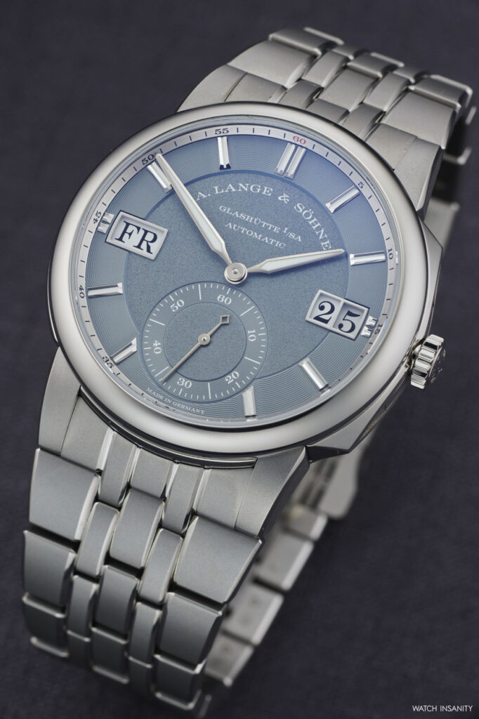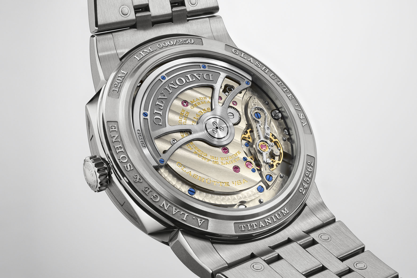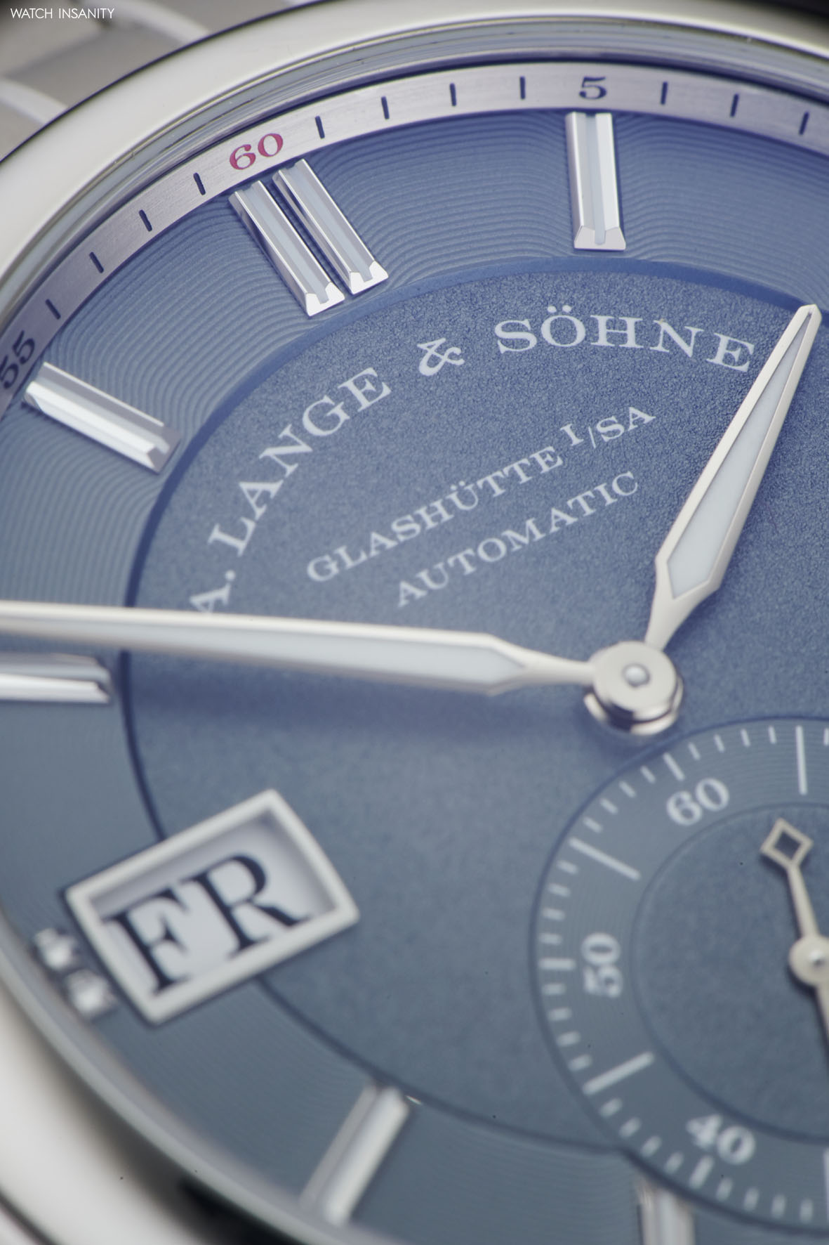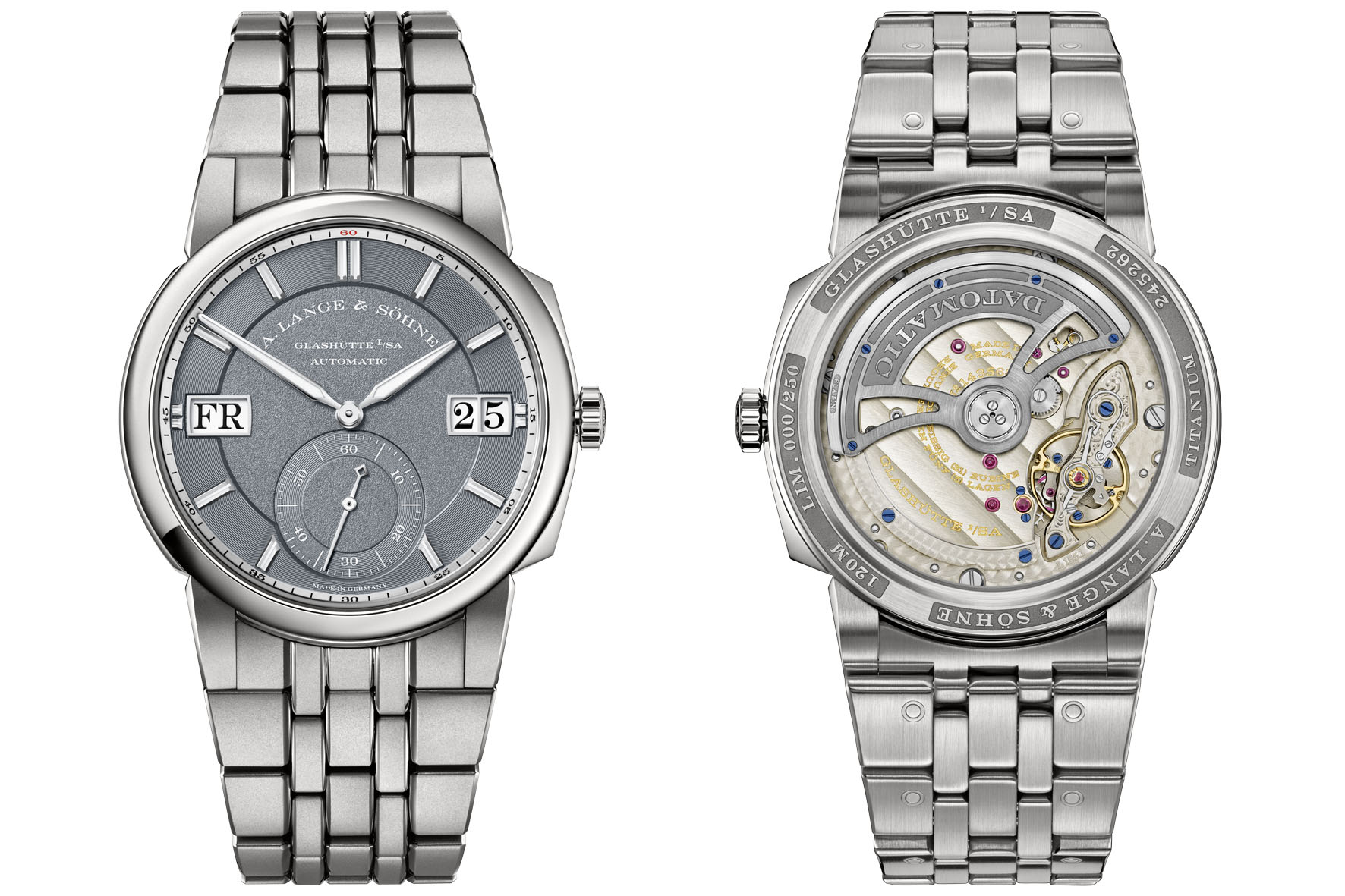 Il nome è composto dalle parole «data» e «automatico». Un rotore centrale scheletrato e parzialmente rodiato nero con una massa oscillante in platino 950 assicura una prestazione di carica efficace. A carica completa, l’autonomia è di 50 ore. Il sistema oscillante è progettato per la massima stabilità di marcia. A tale scopo, il bilanciere che oscilla a 28 800 alternanze/ora (4 hertz), è stato ottimizzato aerodinamicamente con viti di regolazione incassate e montato stabilmente sotto un ponte del bilanciere. Quest’ultimo è inciso a mano con un motivo a onde stilizzate che evoca l’impermeabilità dell’orologio. In linea con la filosofia Lange, tutti i componenti del movimento assemblato due volte sono rifiniti a mano. Tra questi va annoverata la platina in alpacca decorata con levigatura a nastro di Glashütte, in cui un castone d’oro avvitato segna la posizione della ruota dell’ancora. (Prezzo €. 56.400)