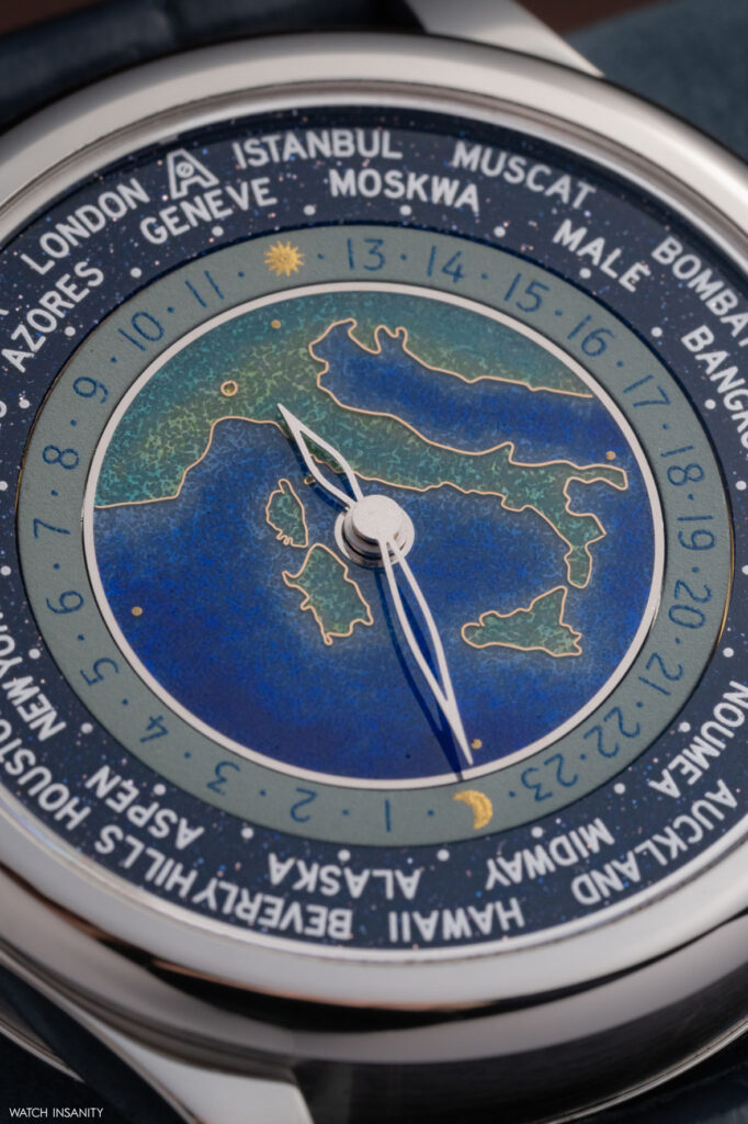 Veniamo dunque agli orologi. La referenza dedicata all’Italia rende omaggio alla bellezza del nostro Paese con una smaltatura cloisonné, nella quale i profili delle coste dello Stivale e delle isole sono realizzati in filo d’oro. I colori dominanti sono il verde delle terre emerse e il blu del mare Mediterraneo. Non si tratta però di lavorazioni piatte e uniformi; la smaltatura verde è infatti screziata, quasi a imitare la varietà delle tonalità naturali di erbe e foglie, mentre quella blu diventa da scura a chiara man mano che si avvicina alle terre emerse.