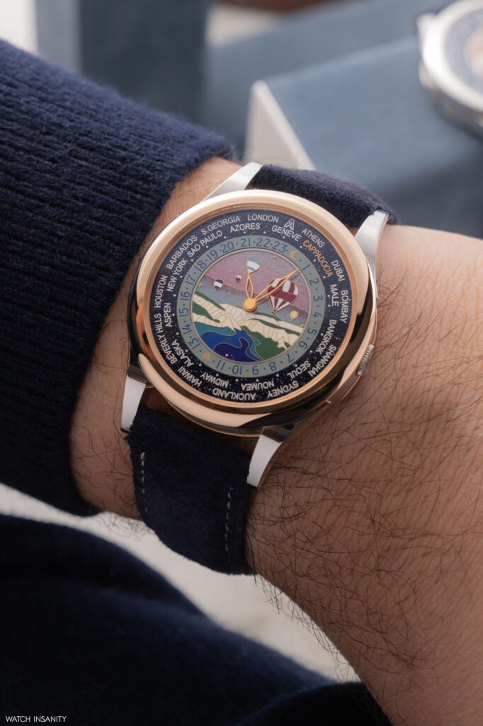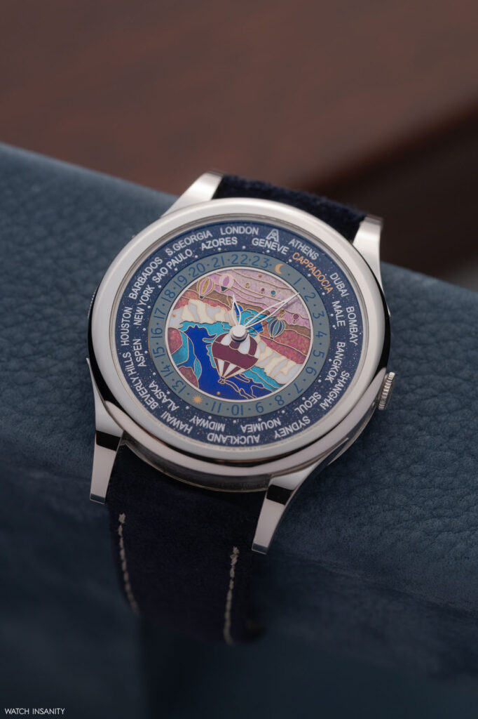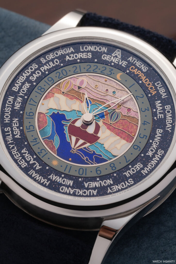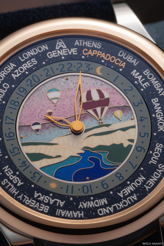 Anche qui il livello di personalizzazione può essere spinto all’estremo; per rendere unico ciascuno dei dieci esemplari, i palloni di ogni quadrante possono presentare motivi differenti. Come New York nella referenza precedente, qui Cappadocia è scritto in oro rosa sull’anello delle città del mondo, per omaggiare questa edizione speciale. Data la vocazione alla customizzazione di ANDERSEN Genève e BCHH, ogni aspetto dell’orologio può essere personalizzato: dai nomi delle città, alle immagini smaltate, al motivo guilloché sulla massa oscillante.