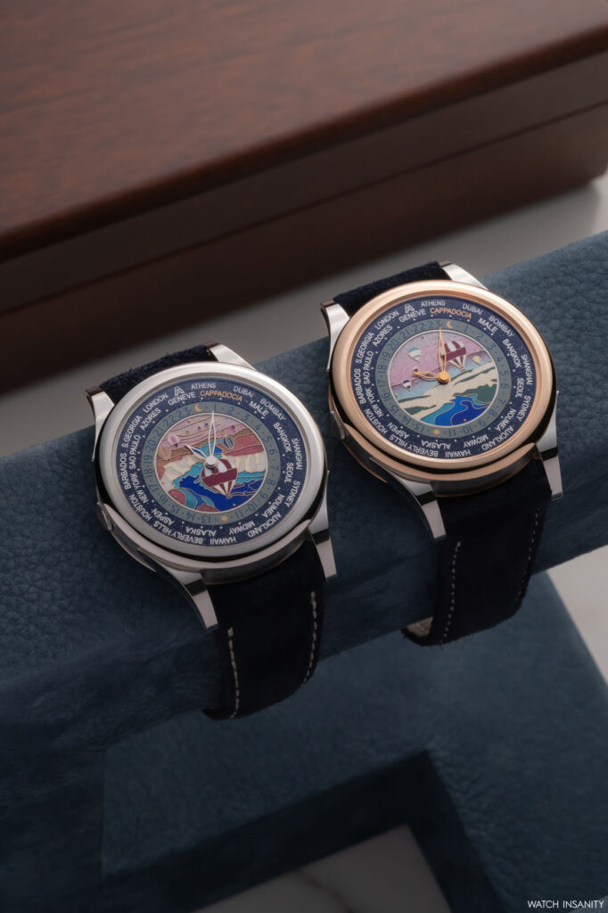 La prima versione del Sunset over Cappadocia, realizzata in 10 pezzi con cassa in platino è sold out. È stata fatta seguire da ANDERSEN Genève da una novità appena lanciata: alle anse in platino si affianca infatti una cassa in oro rosa, che si abbina con il colore delle lancette scheletrate e con i toni caldi del quadrante. Questa versione bicolore è realizzata in 20 esemplari.