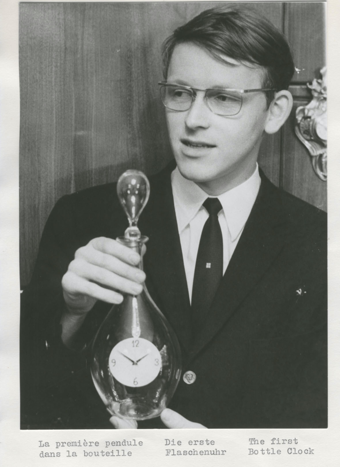 Di lì a pochi anni ebbe quella intuizione che lo portò alla ribalta. Tutto nacque dall’osservazione di una bottiglia vuota, residuo dei festeggiamenti di un Capodanno; siccome in bottiglia si mettevano i velieri, perché non metterci anche un segnatempo? Nacque così, nel 1969, il Bottle Clock, l’orologio “impossibile” di Svend Andersen. Presentato al salone “Montres et Bijoux” di Ginevra, fu un successo di critica e la rampa di lancio del giovane artigiano nel mondo della grande orologeria.