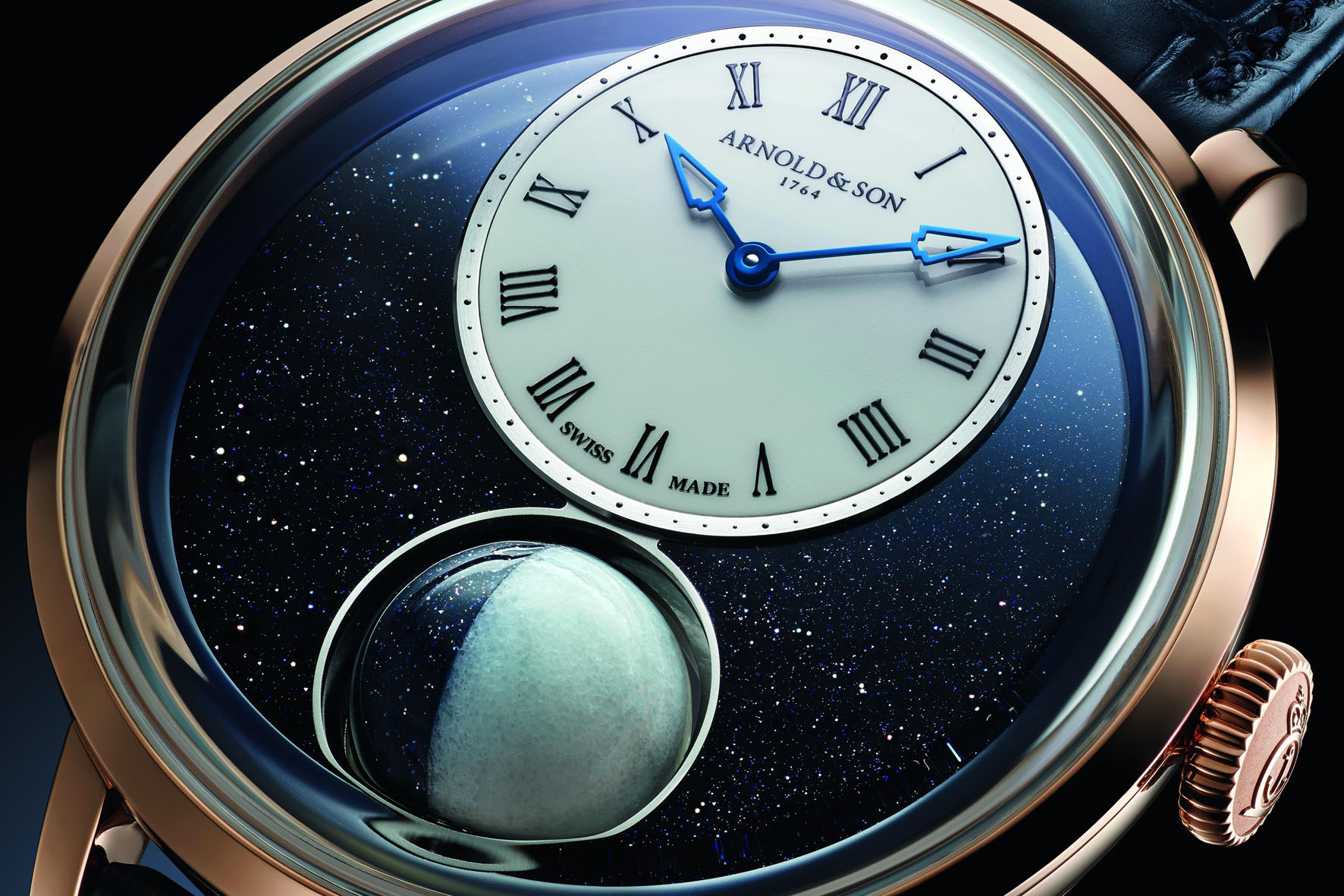 In una cassa in oro rosso di 44 mm, Arnold & Son ha ripreso uno degli elementi che la contraddistinguono. Il quadrante delle ore e dei minuti laccato bianco, libera uno spazio per la visualizzazione delle complicazioni sul resto del quadrante in vetro avventurina. In questo caso, si tratta di una luna sferica di 12 mm di diametro. Le sue dimensioni non costituiscono l’unico tratto distintivo. È realizzata per metà in marmo, che rappresenta la parte illuminata dell’astro, e per metà in avventurina, che costituisce la parte oscurata; due materiali mai usati prima in questa rappresentazione tridimensionale.