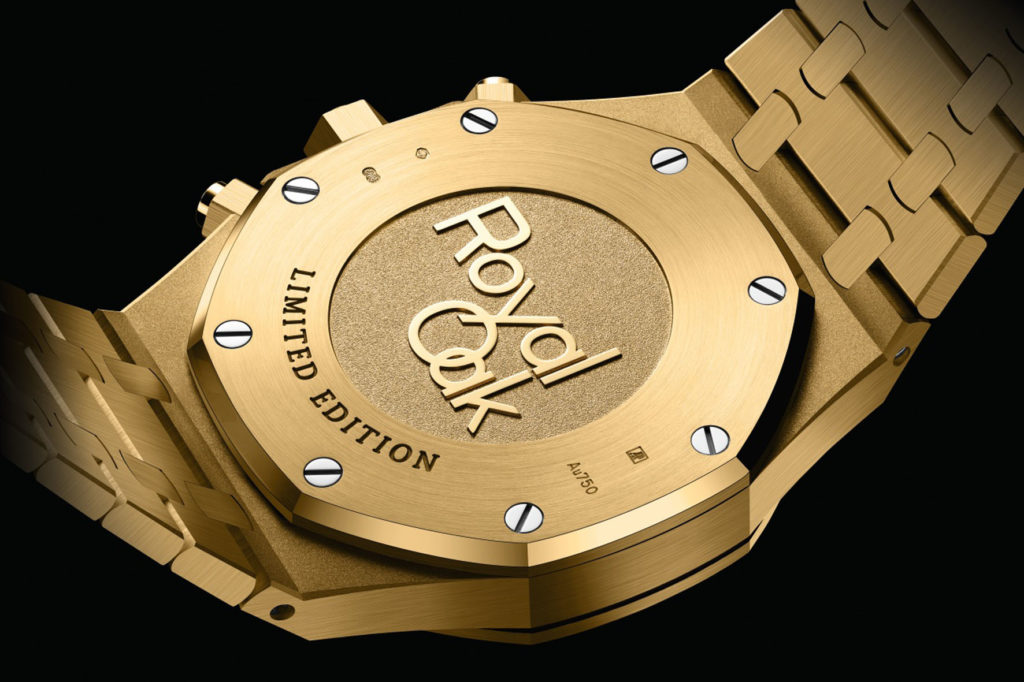 Sul fondello l’incisione “Limited Edition” (125 esemplari). Questa versione del Royal Oak monta il Calibro di Manifattura 2385 a carica automatica che include una massa oscillante in oro 18 carati. Oltre al bracciale in oro giallo con chiusura déployante AP, il modello presenta due cinturini supplementari: in pelle di vitello verde e in caucciù verde.
