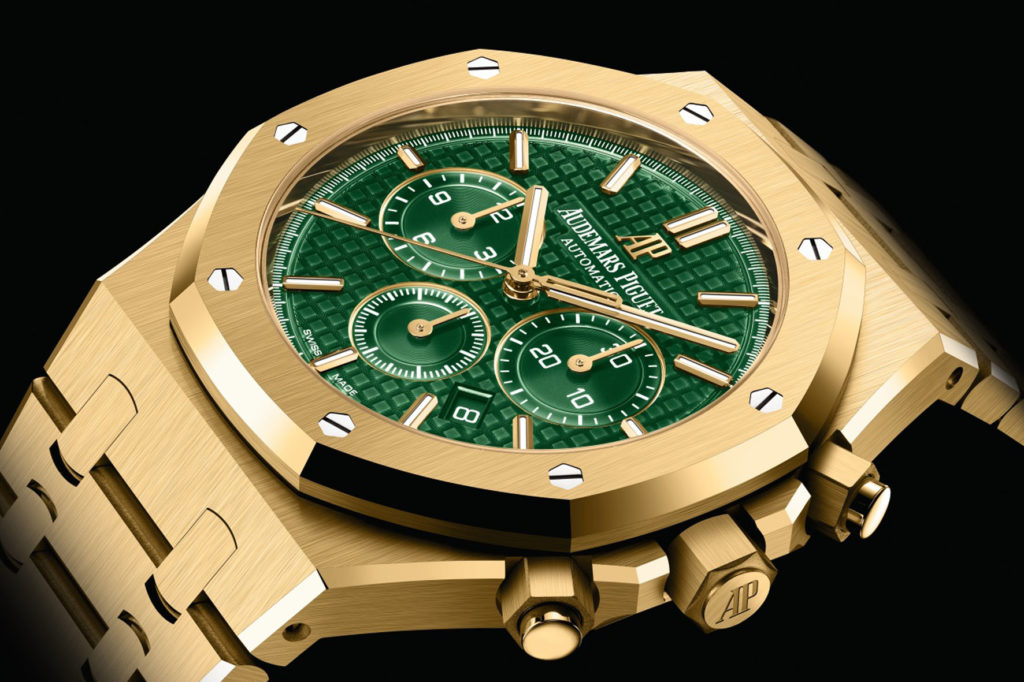 Il Royal Oak Cronografo Automatico si presenta in una nuova varietà di colori che unisce una cassa da 41mm in oro giallo 18 carati a un quadrante verde. Il quadrante è decorato con un motivo “Grande Tapisserie” e impreziosito da tre contatori dei secondi a chiocciola. Il nome “Audemars Piguet” sul quadrante è in oro 24 carati e realizzato in accrescimento galvanico.