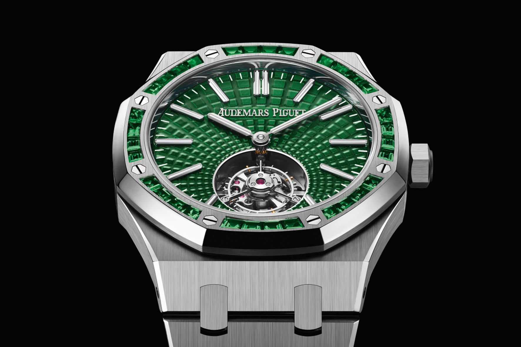 Il Royal Oak Automatico con Flying Tourbillon mette in mostra i talenti degli artigiani della Manifattura con tre nuove varianti e tante diverse rifiniture realizzate a mano. Ogni versione è presentata con una cassa da 41 mm e dotata di un quadrante verde con motivo Tapisserie arricchito dalla finitura soleil.