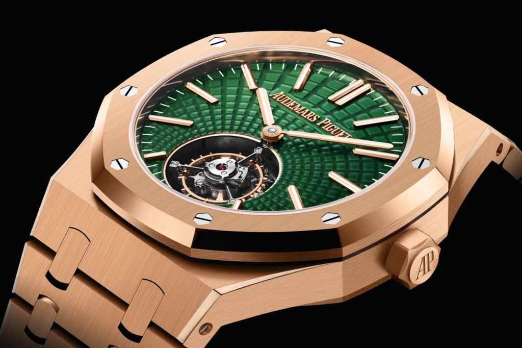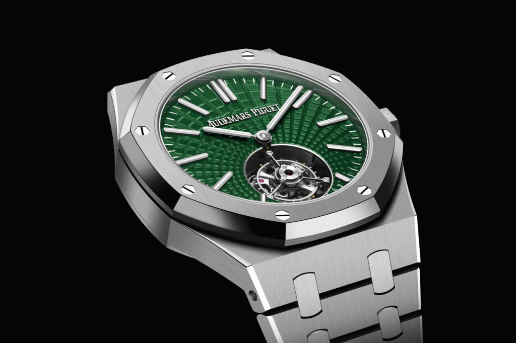 22 Marzo 2021La collezione Royal Oak si tinge di verde. Le nuove proposte di Audemars Piguet comprendono: un Royal Oak “Jumbo” Extra-Piatto in platino 950 con quadrante verde fumé e finitura soleil, un’edizione limitata del Royal Oak Cronografo Automatico con cassa in oro giallo 18 carati e quadrante verde “Grande Tapisserie” e infine tre varianti del nuovo Automatico con Flying Tourbillon in titanio o oro rosa, caratterizzate sempre da tonalità verdi.
