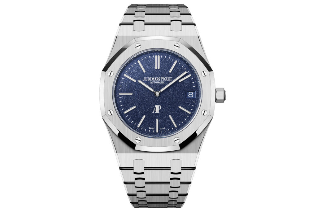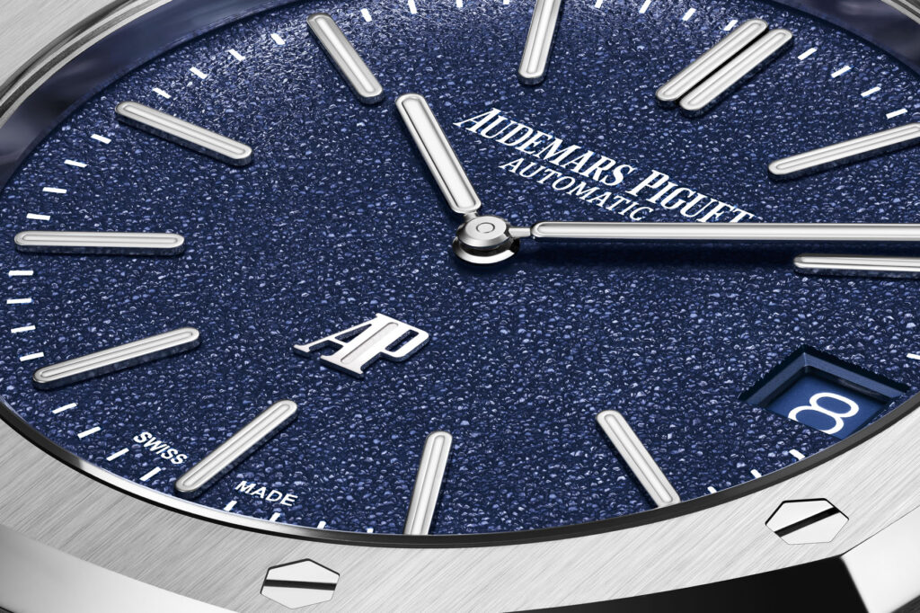 Audemars Piguet ha rielaborato la texture del quadrante di questa nuova referenza per offrire una grana più fine e più luminosa che gioca con la luce in modo diverso. Ottenuta tramite PVD, la tonalità blu è poi dotata di un rivestimento traslucido che accentua il rilievo e la brillantezza del quadrante.