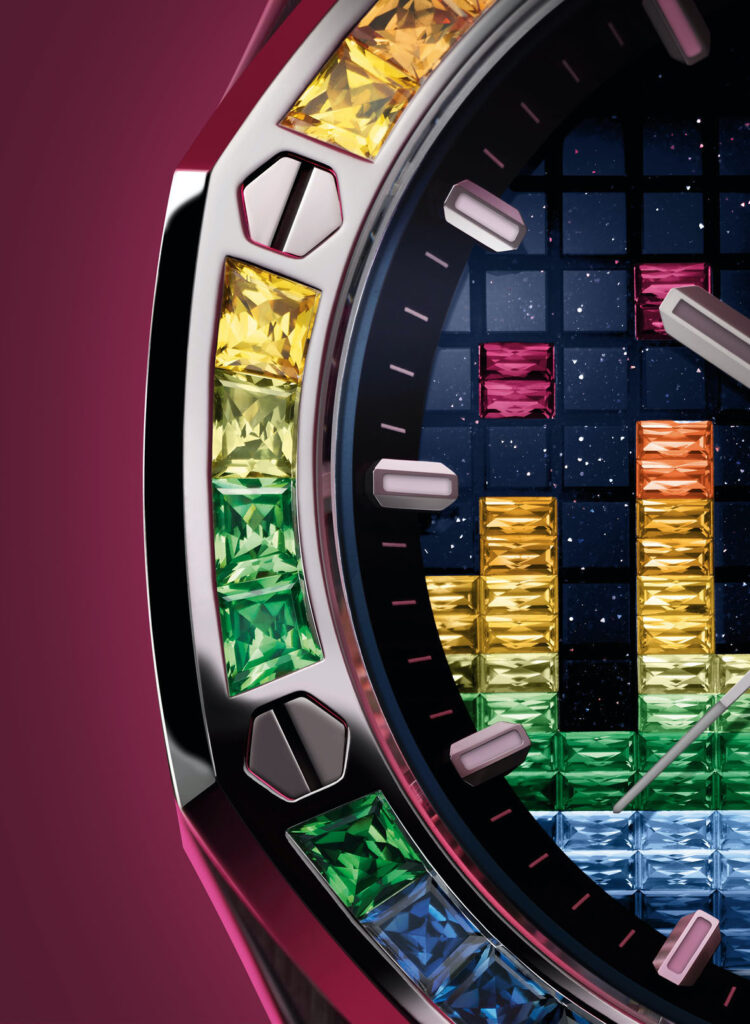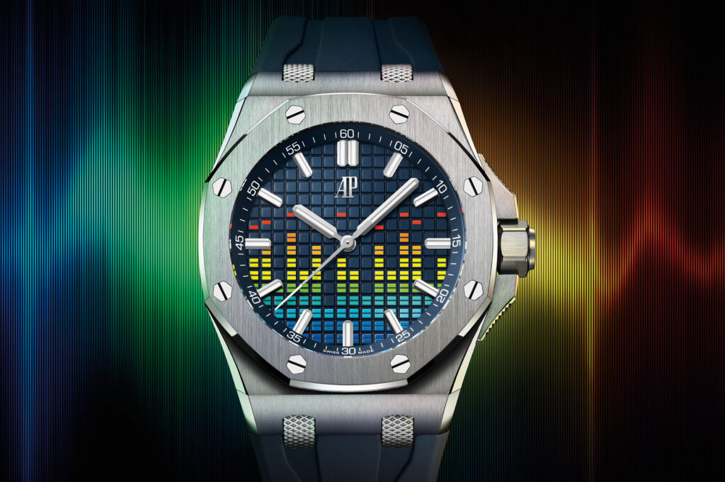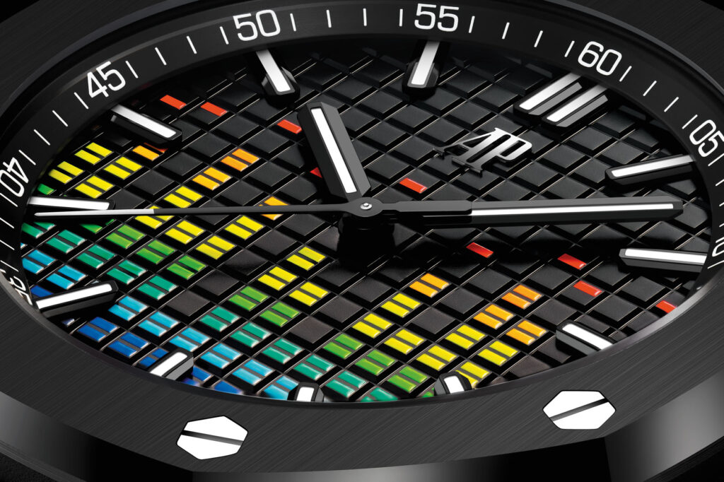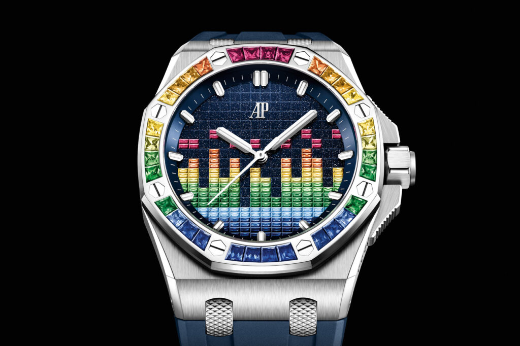 l modello da 37 mm ha gli stessi codici estetici dei cronografi Royal Oak Offshore dello stesso diametro e presenta anche le smussature più ampie e il vetro curvo delle ultime edizioni da 43 mm. L’assenza della finestrella della data lascia tutto lo spazio al motivo colorato dell’equalizzatore. L’orologio è accompagnato da un cinturino intercambiabile in caucciù blu con motivo “effetto mosaico” abbinato al colore del quadrante. È la prima volta che un modello da 37 mm è dotato del sistema dei cinturini intercambiabili introdotto dalla Manifattura nel 2021 sulla collezione Royal Oak Offshore. Tre cinturini supplementari in caucciù turchese, giallo e verde, anch’essi con motivo “effetto mosaico”, completano il modello. (Prezzo € 28,200)