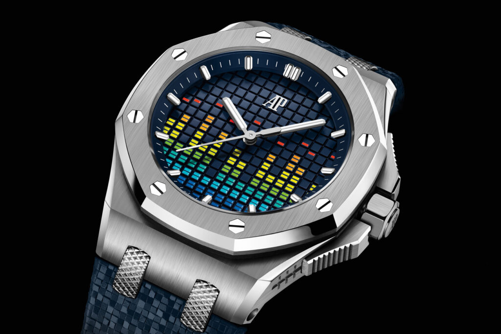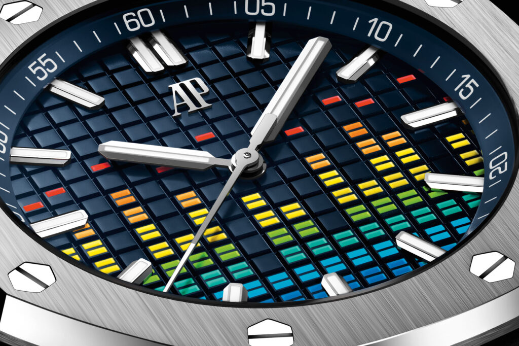 I primi due modelli di Royal Oak Offshore Automatico Music Edition sono concepiti in titanio in due diametri da 37 mm e da 43 mm. Entrambi presentano un quadrante blu che fa da sfondo alla colorata decalcomania del vu meter. Il quadrante è impreziosito dal monogramma AP applicato in oro bianco lucido a ore 12, così come dagli indici e dalle lancette delle ore e dei minuti, anch’essi in oro bianco 18 carati, dotati di un rivestimento luminescente per una visibilità ottimale.