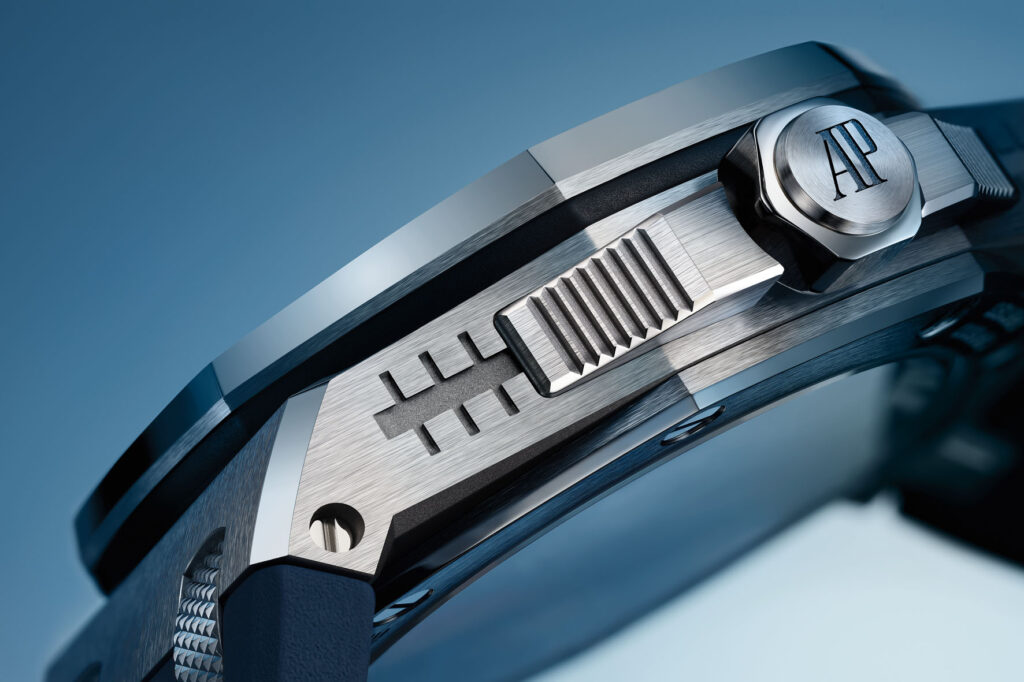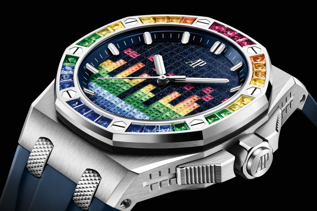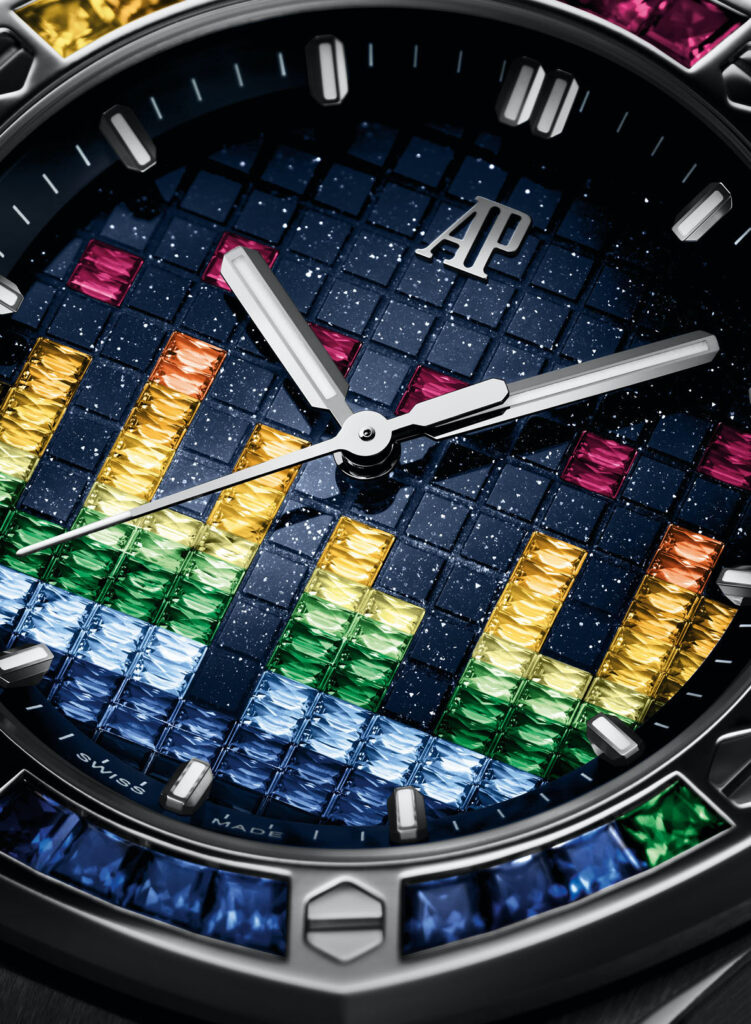 La referenza da 37 mm è decorata con 166 pietre per un totale di ~3,7 carati, mentre la variante da 43 mm risplende grazie a 230 pietre per un totale di ~6,15 carati. Come i modelli in titanio, queste due referenze presentano il monogramma AP lucido applicato a ore 12 insieme a indici e lancette in oro bianco 18 carati. Impreziosite da un cinturino intercambiabile blu – con motivo “effetto mosaico” per la referenza da 37 mm – e da tre cinturini in caucciù supplementari in turchese, giallo e verde. (Prezzi su richiesta)