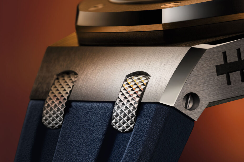 Entrambe le versioni sono dotate di un quadrante in avventurina blu che riproduce – come sui modelli in titanio l’immagine di un vu meter musicale. I dieci colori che compongono le colonne dell’equalizzatore sono ottenuti grazie all’incastonatura invisibile di diverse pietre: rubini, peridoti, tsavoriti, zaffiri verdi, blu e arancio. Pietre di colore simile (rubini, tsavoriti e zaffiri gialli, arancio, verdi e blu) impreziosiscono anche la lunetta di entrambe le referenze, abbinandosi armoniosamente ai toni del quadrante.
