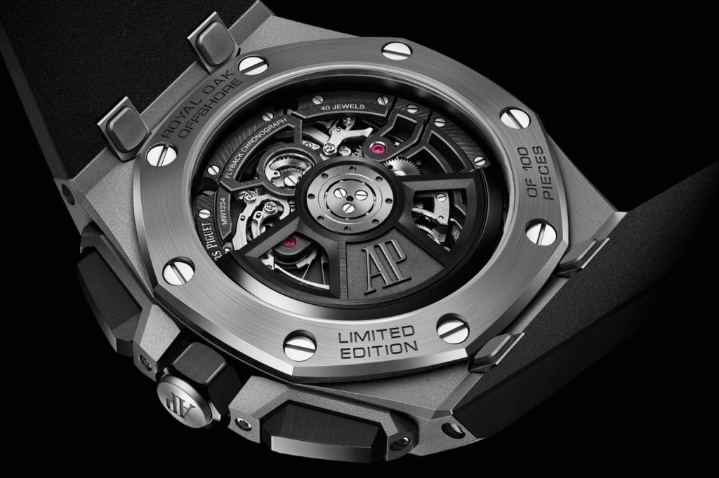 Anche la corona avvitata e i pulsanti del cronografo in ceramica nera seguono una curvatura, riprendendo le sfumature grigie e più scure del movimento. Il fondello in vetro zaffiro reca l’incisione “Royal Oak Offshore Edizione Limitata a 100 Esemplari”.