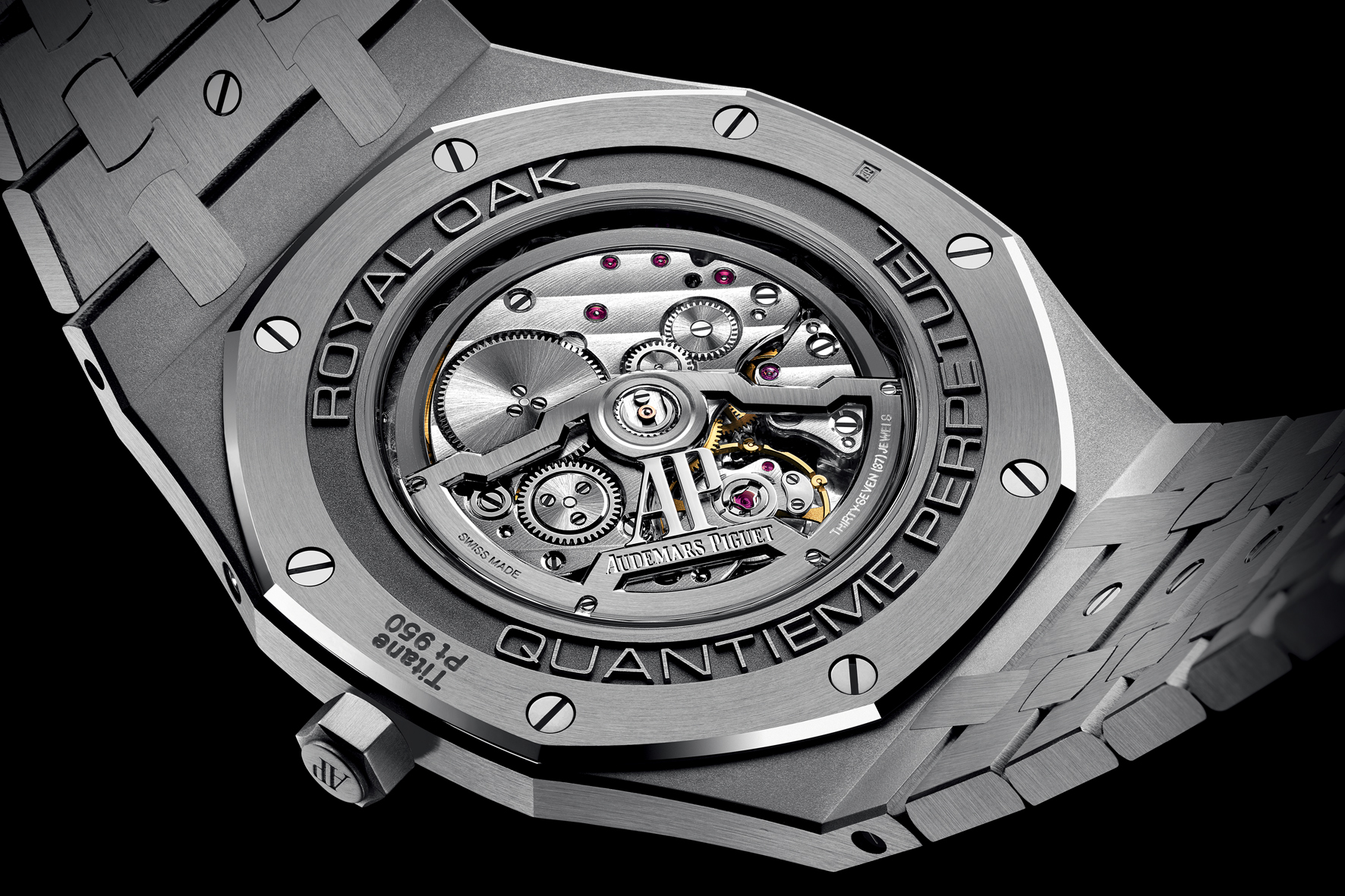 Evoluzione dell’iniziale prototipo RD#2 in platino 950 presentato al SIHH 2018, il Royal Oak Calendario Perpetuo Extra-Piatto Automatico coniuga due metalli, il titanio e il platino 950, per un risultato elegante e una straordinaria leggerezza al polso. L’alternanza di superfici lucide e satinate su cassa, bracciale e lunetta esalta il contrasto estetico tra i due materiali. Inoltre, il quadrante di quest’ultimo modello non presenta più il motivo “Grande Tapisserie” blu, sostituito da una finitura satinata sempre dello stesso colore che ne migliora la leggibilità e l’estetica.