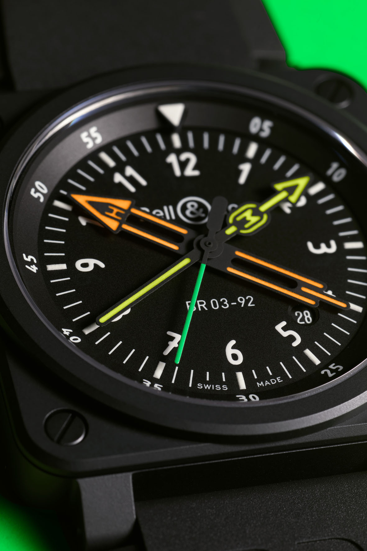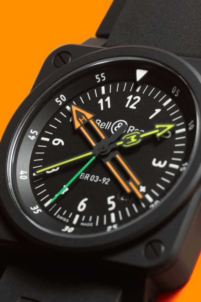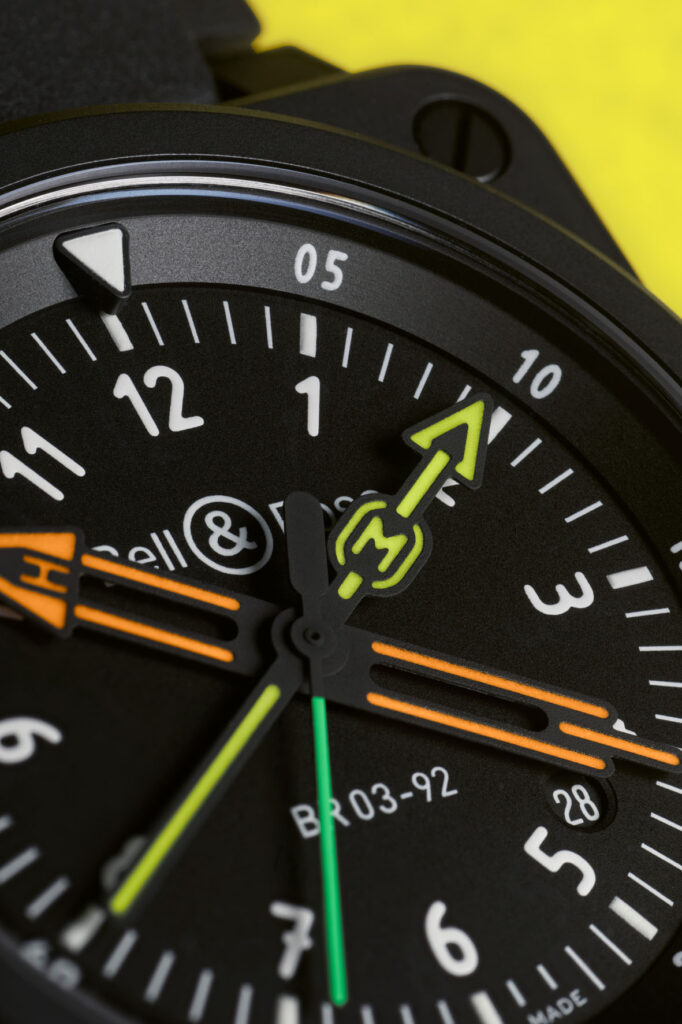 Gran parte dell’originalità del BR 03-92 Radiocompass deriva dalle sue inusuali lancette che riprendono la particolare forma di quelle del Radio Compass. Inoltre, adottano 3 colori complementari e queste tonalità pop, quasi fosforescenti, contrastano con il nero opaco del quadrante, consentendo una facile lettura dell’ora.