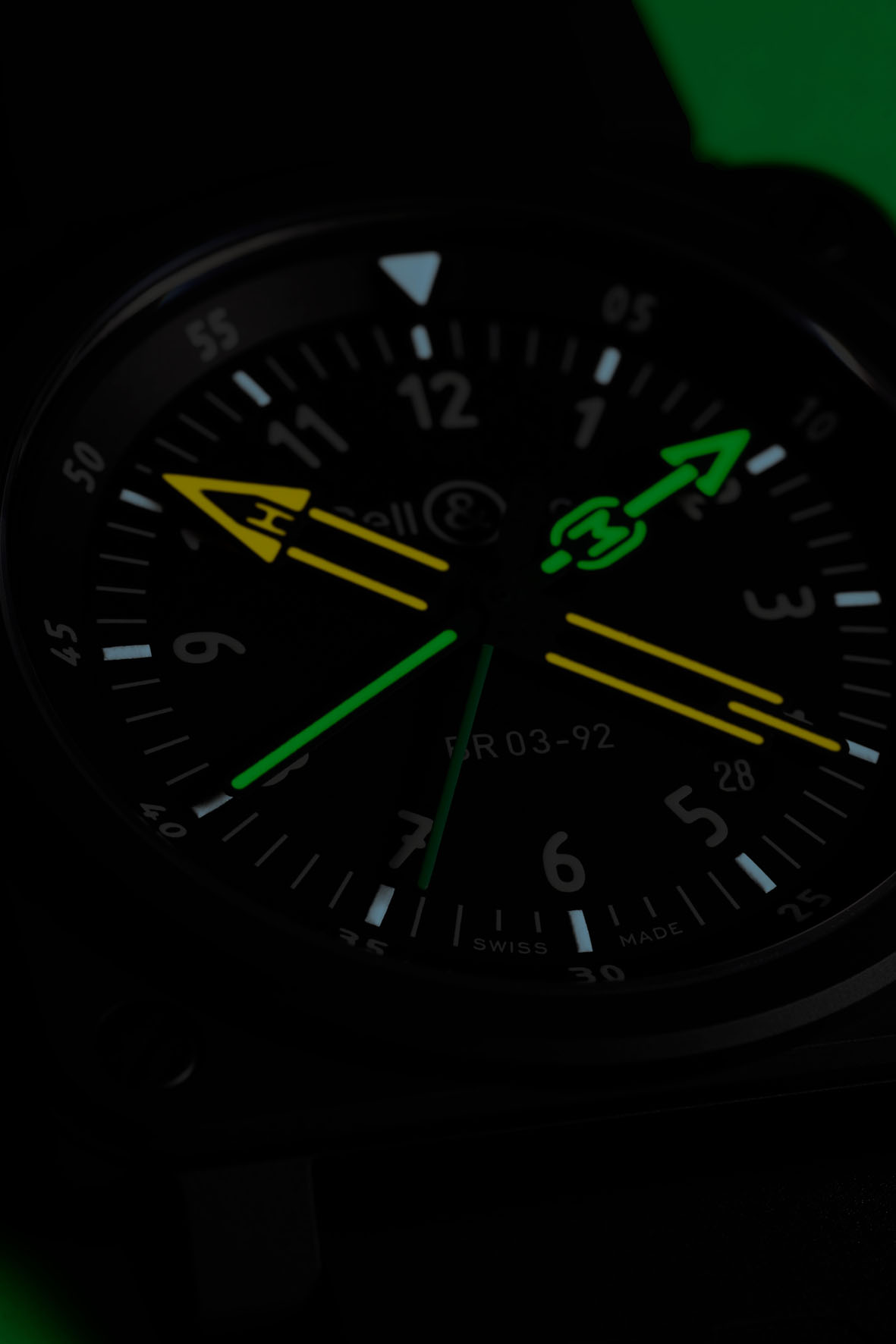 L’esclusivo quadrante del Bell & Ross BR 03-92 Radiocompass riproduce la visualizzazione dell’omonimo strumento, reinterpretando le sue lancette e le sue tonalità che consentono una leggibilità ottimale in ogni circostanza. Per il quadrante del BR 03-92 Radiocompass, i team di sviluppo di Bell & Ross hanno riprodotto fedelmente la grafica dello strumento che è servito di inspirazione.