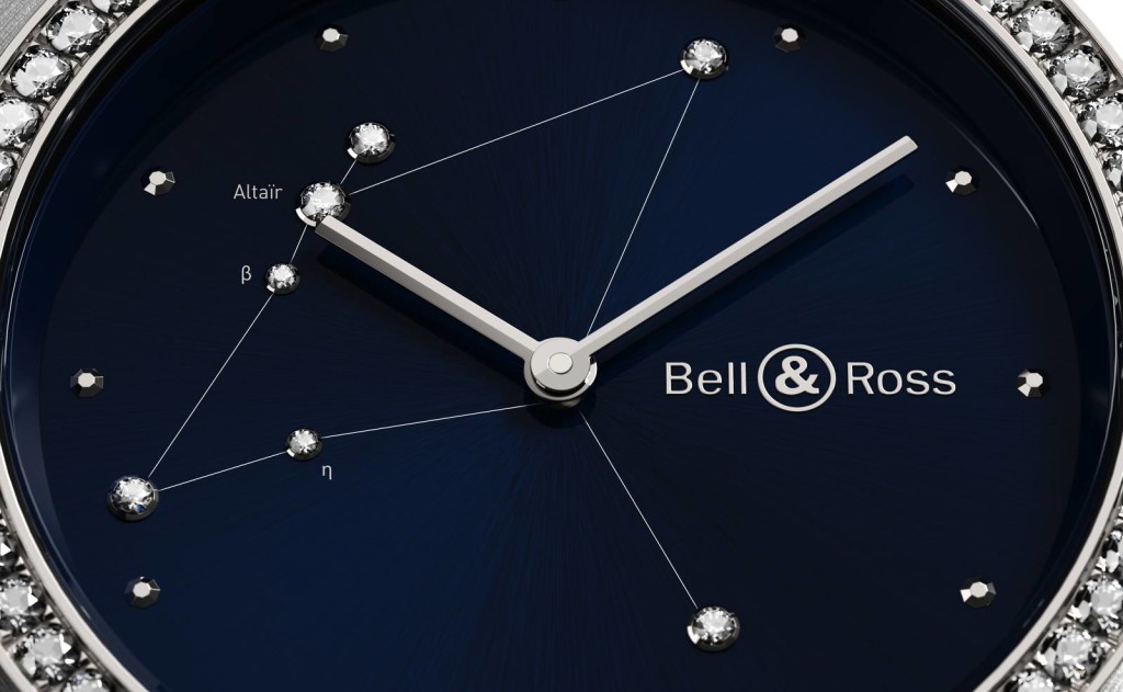 Dal design pulito e sofisticato, il BR S Diamond Eagle richiama la connotazione celeste in tutti i suoi dettagli, come il quadrante e il cinturino in alligatore blu notte, gli indici metallici brillanti e i sette diamanti che rievocano gli astri. La disposizione delle gemme sul quadrante riproduce la costellazione dell’aquila, uccello mitico e dalla dimensione altamente simbolica: era infatti uno degli attributi di Giove, il dio del cielo. Anche il fondello inciso riprende il disegno stilizzato della costellazione dell’aquila.