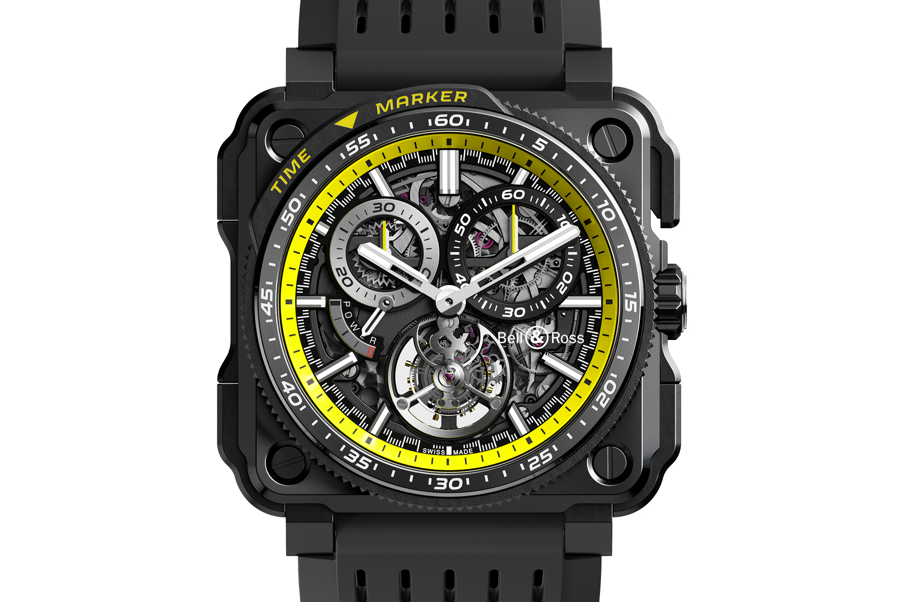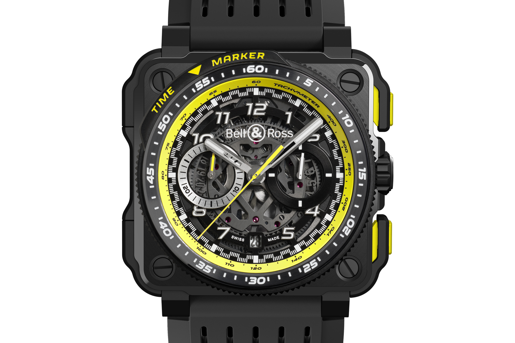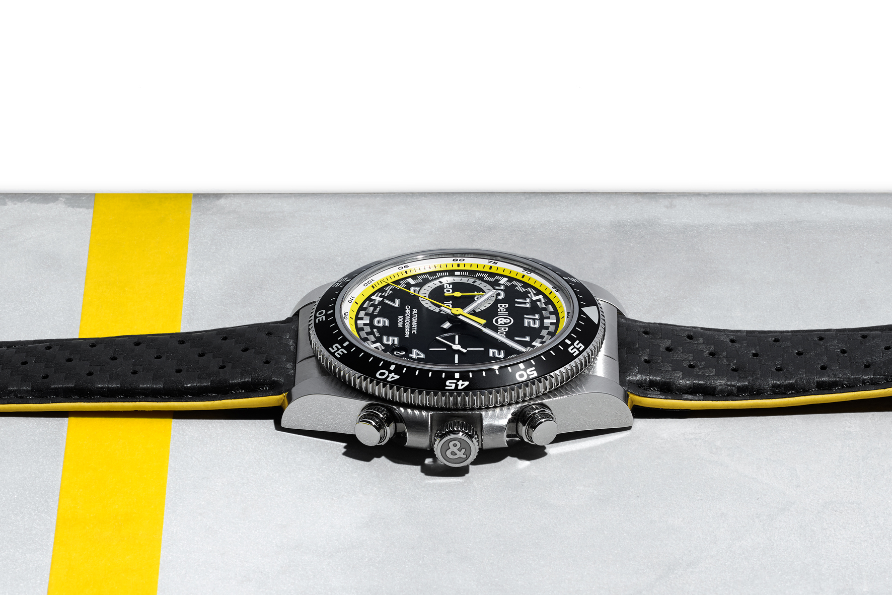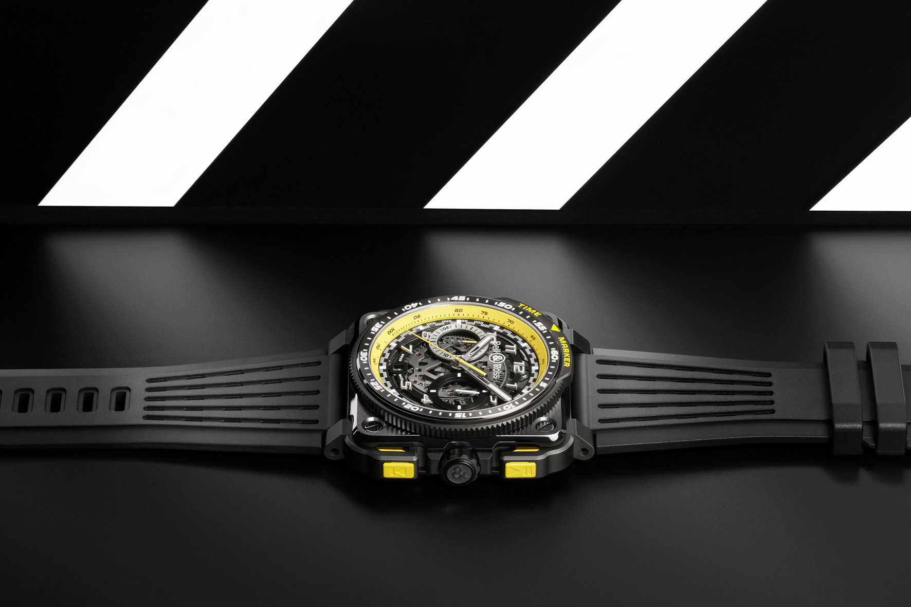 I pulsanti a bascula bi-materiale ricordano i comandi della velocità del volante. Un anello in acciaio trattato PVD ruota attorno alla lunetta. Il quadrante scheletrato lascia intravedere il Calibro BR-CAL.313 a carica automatica. (Prezzo 19.900)