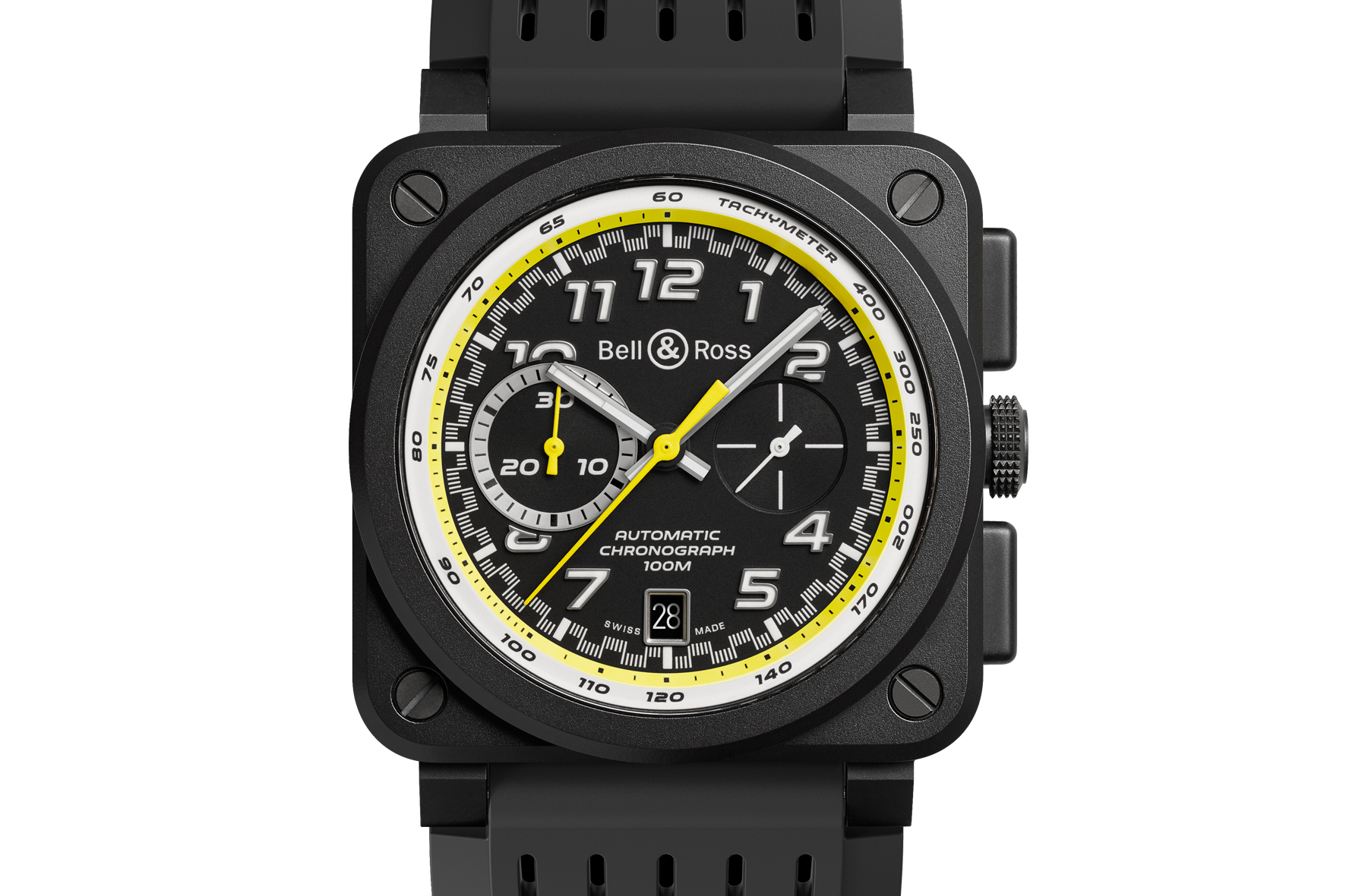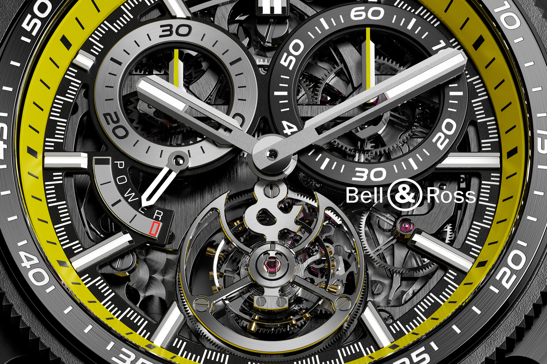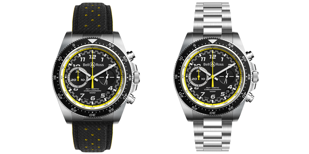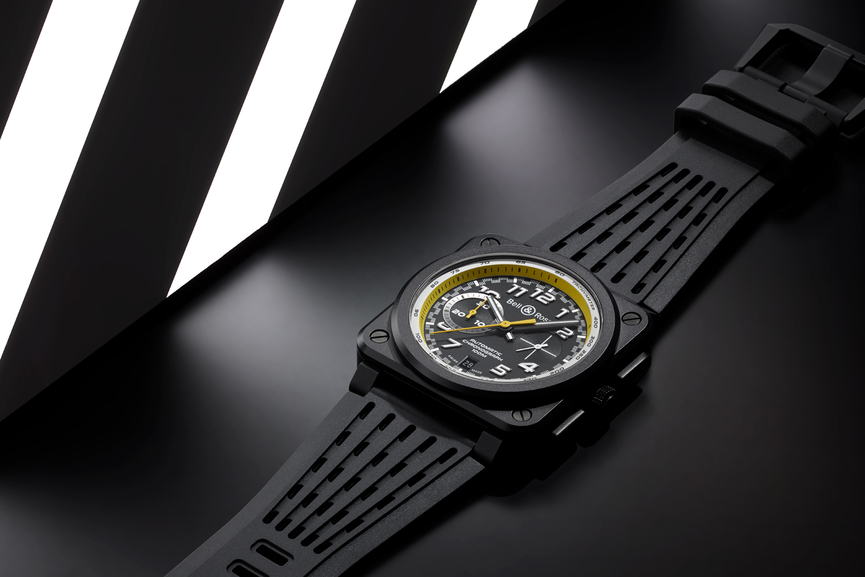 I pulsanti a bascula bi-materiale ricordano i comandi della velocità del volante. Un anello in acciaio trattato PVD ruota attorno alla lunetta. Il quadrante scheletrato lascia intravedere il Calibro BR-CAL.313 a carica automatica. (Prezzo 19.900)