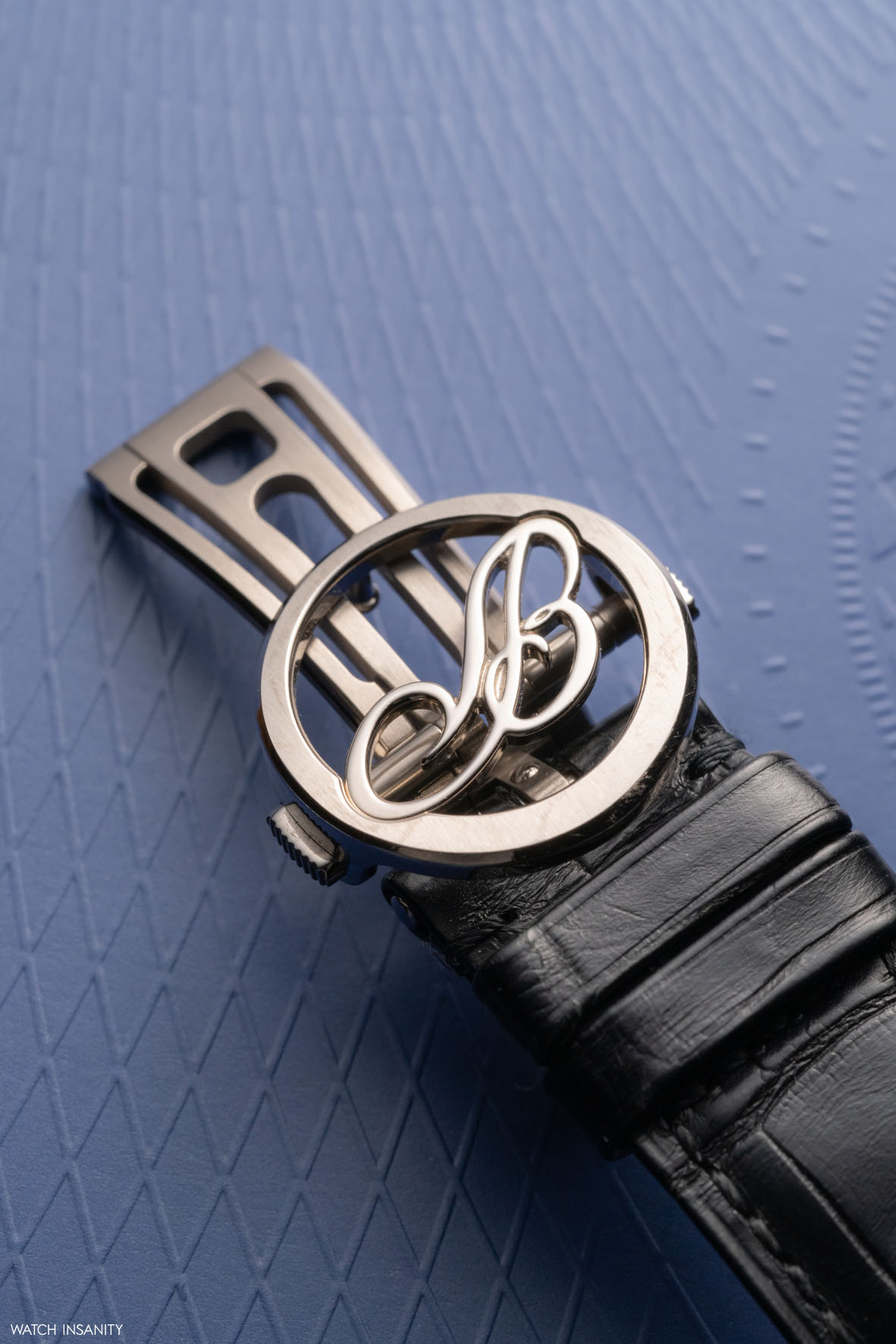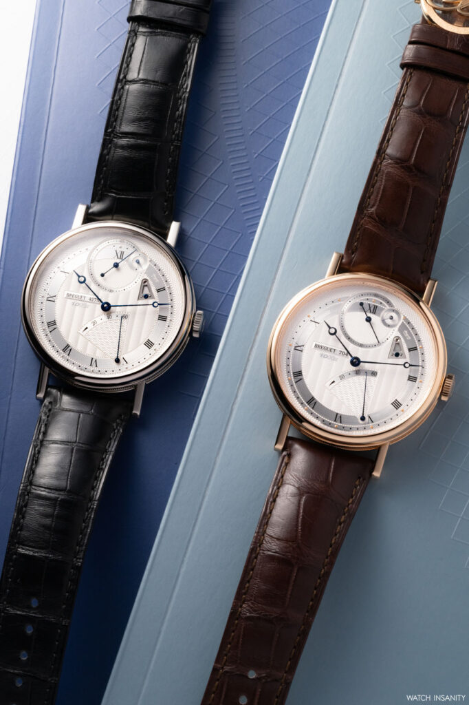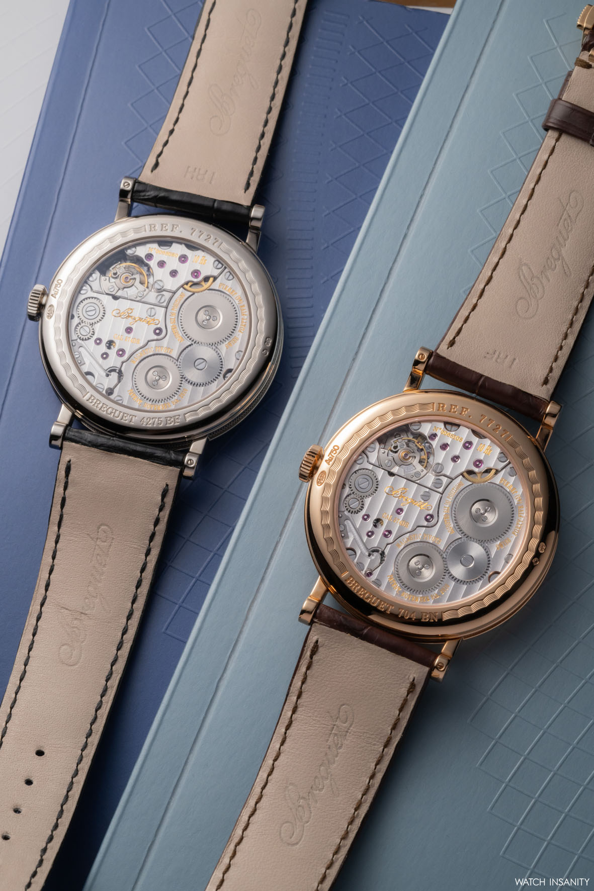 Le lancette azzurrate Breguet sono le classiche a pomme évidée, in acciaio levigato, mentre la firma segreta a ore 10:30 e a ore 1:30 completa gli elementi identificativi dell’orologio. Dettaglio non banale è l’impermeabilità della cassa, garantita fino a 3 bar; un valore che ci si aspetta da una referenza elegante come questa, oltretutto con il fondello in vetro zaffiro. La versione con cassa in oro rosa ha un cinturino in pelle marrone, nero su quella in oro bianco. Quest’ultima è più cara: 52.200 euro contro i 51.700 euro della referenza in oro rosa.