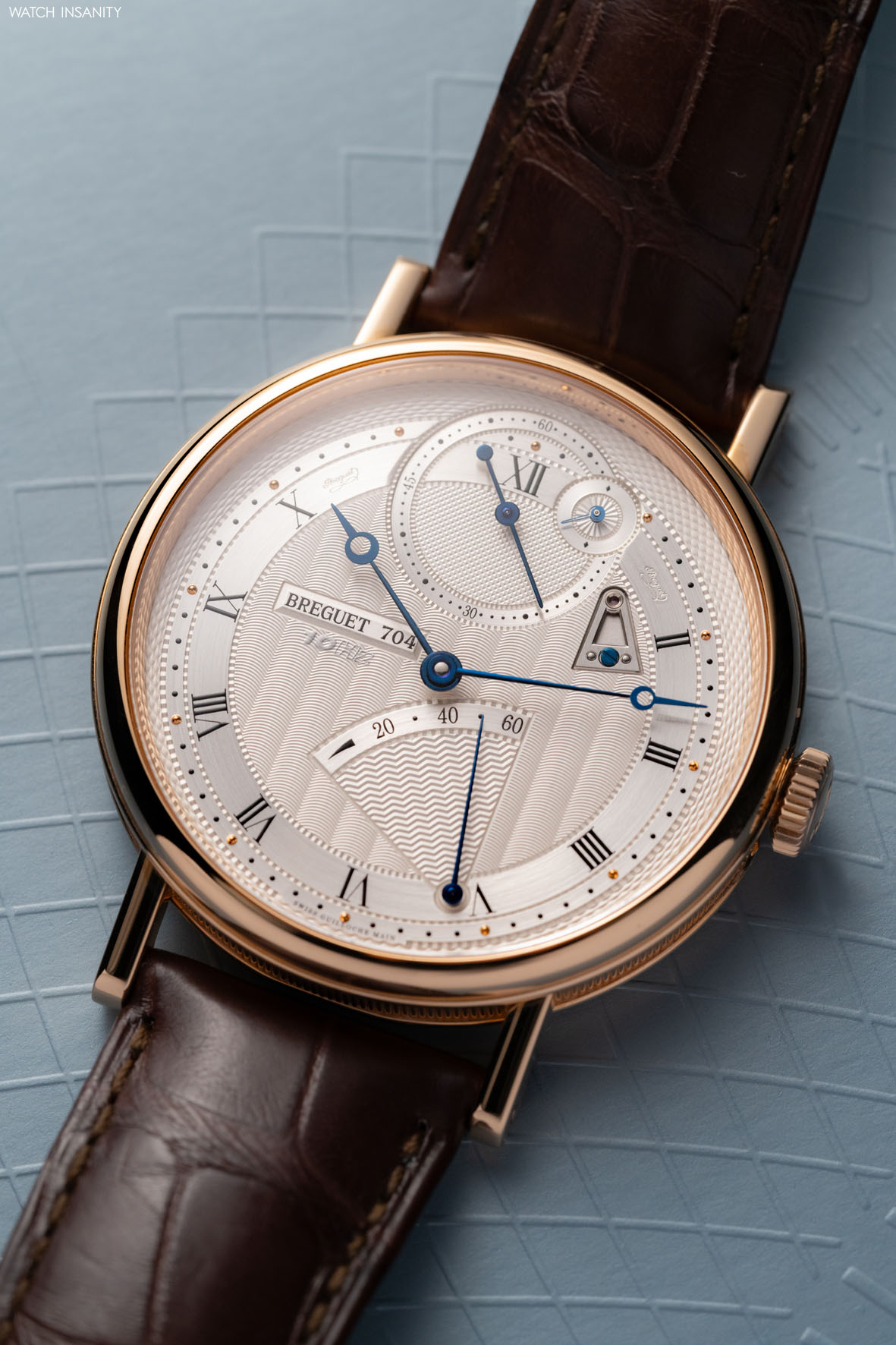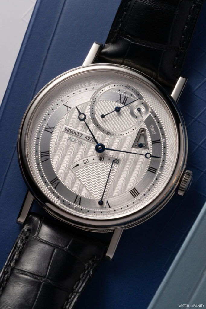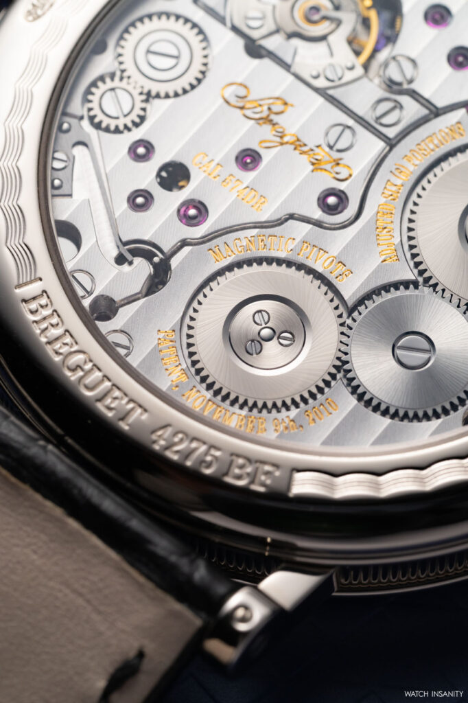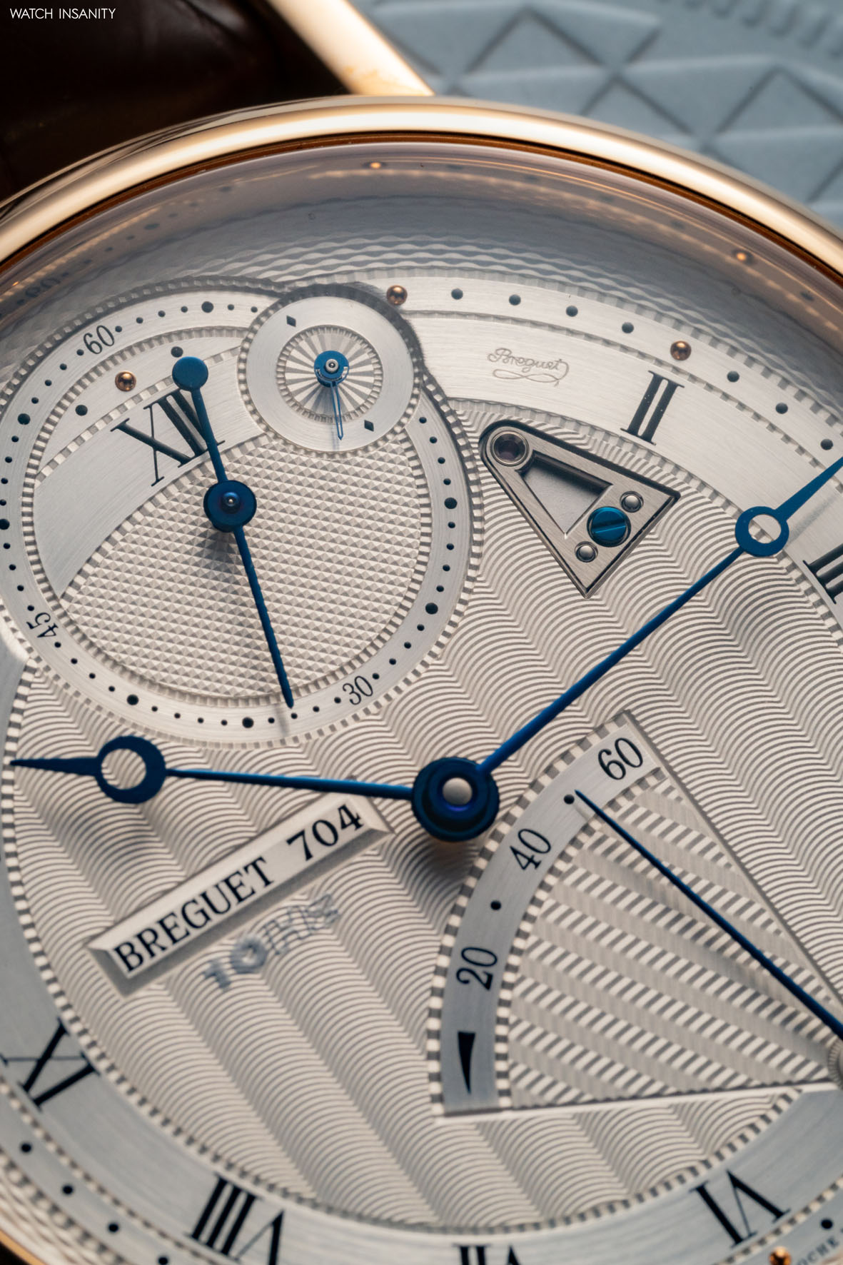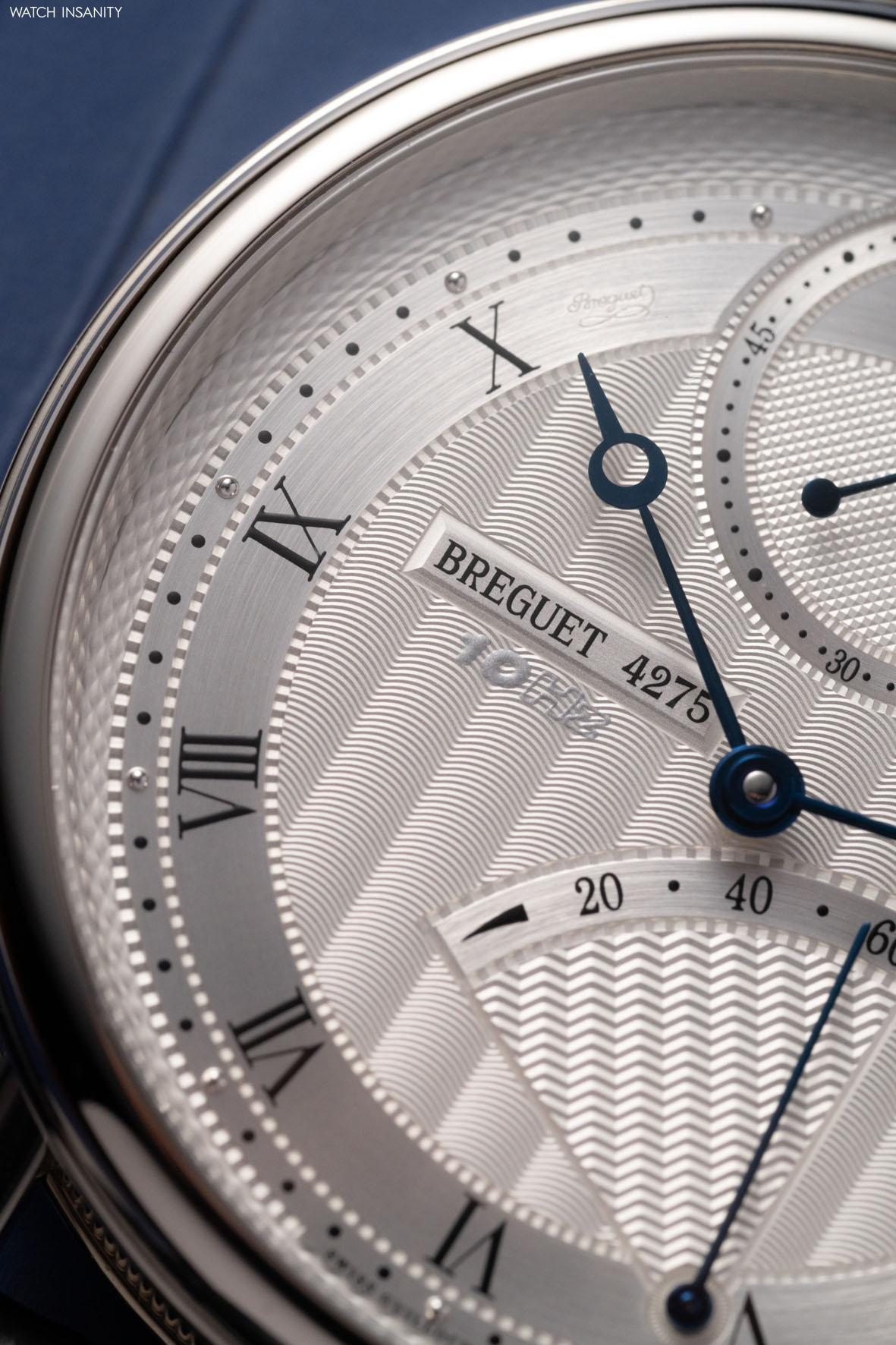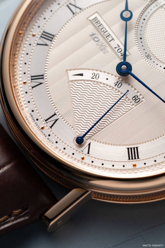 Ogni dettaglio estetico del quadrante conferma immancabilmente che siamo di fronte a una creazione firmata Breguet. Il quadrante è rifinito a mano e ospita sei diverse lavorazioni: vagues de Genève per la parte centrale, clous de Paris per il contatore dei secondi, guillochage soleil per il contatore dei decimi di secondo e guillochage en chevrons per il “ventaglio” della riserva di carica. Inoltre, il giro delle ore presenta il motivo a guillochage liseré, mentre il bordo esterno è decorato con grains d’orge.