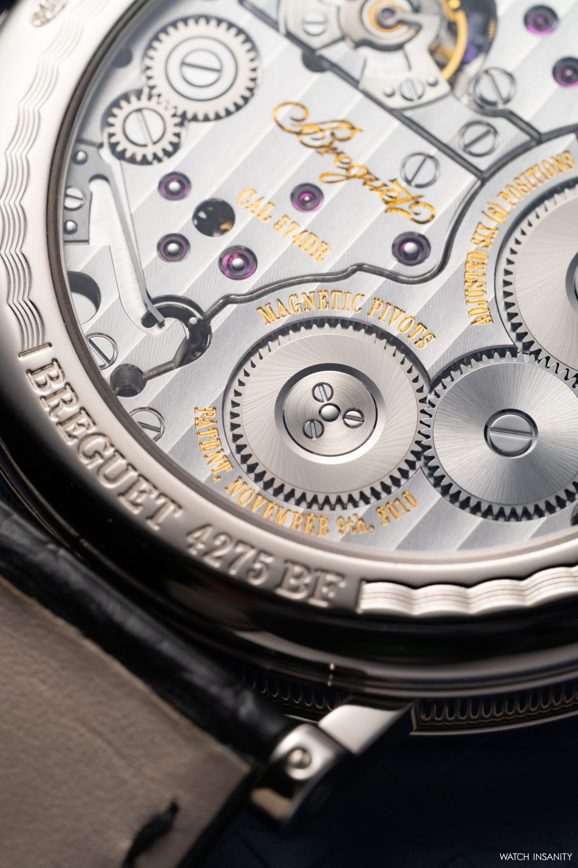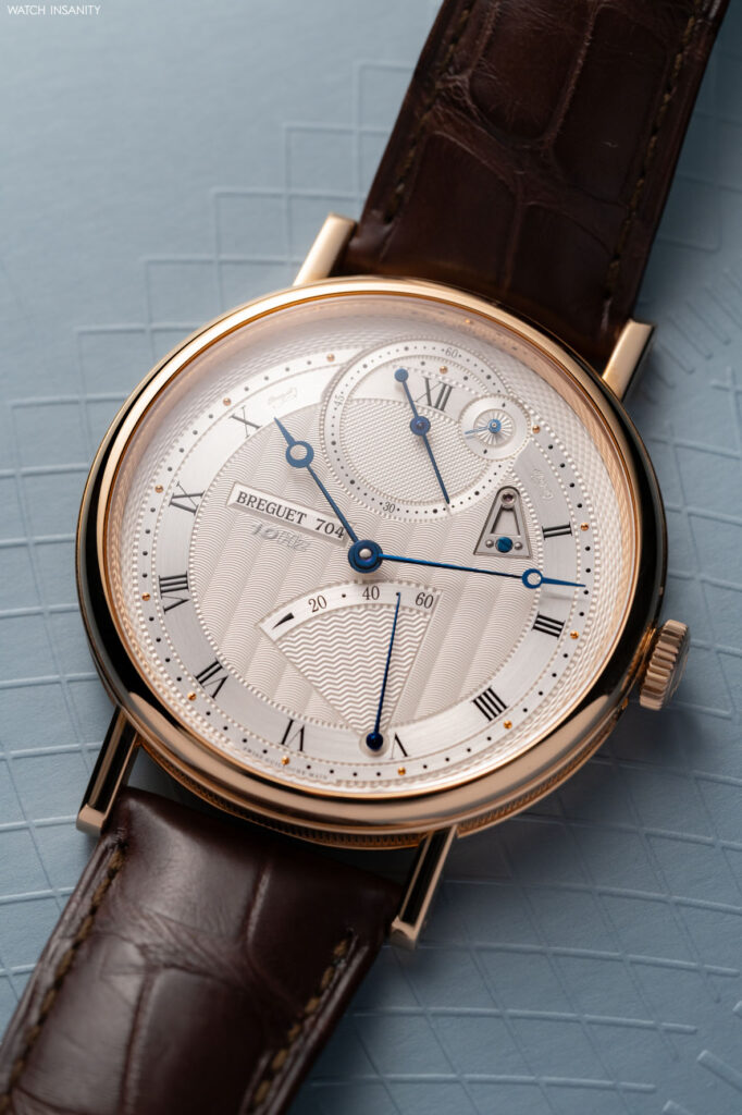 Il quadrante ha la classica firma estetica di Breguet, con il giro delle ore e dei minuti leggermente decentrato a sinistra. Il contatore dei piccoli secondi si trova a ore 12 mentre l’indicatore della riserva di carica, con la classica forma a ventaglio e la lancetta allungata, è posizionato a ore 5. L’armonia del quadrante è bilanciata da due dettagli interessanti, che si trovano rispettivamente a ore 1 e a ore 2: un indicatore del decimo di secondo e il cosiddetto paracadute.