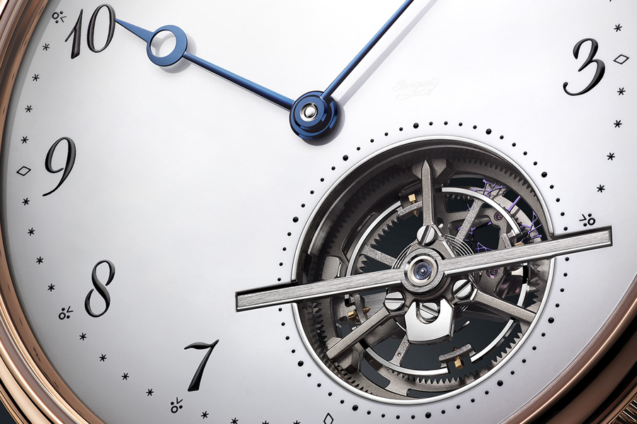 Il giro delle ore con numeri arabi Breguet è decentrato a ore 11, diametralmente opposto al tourbillon situato a ore 5. Questa disposizione degli indicatori ricorda molto gli orologi da tasca realizzati da A.L. Breguet, al quale piaceva rivoluzionare le convenzioni estetiche degli orologi della sua epoca.