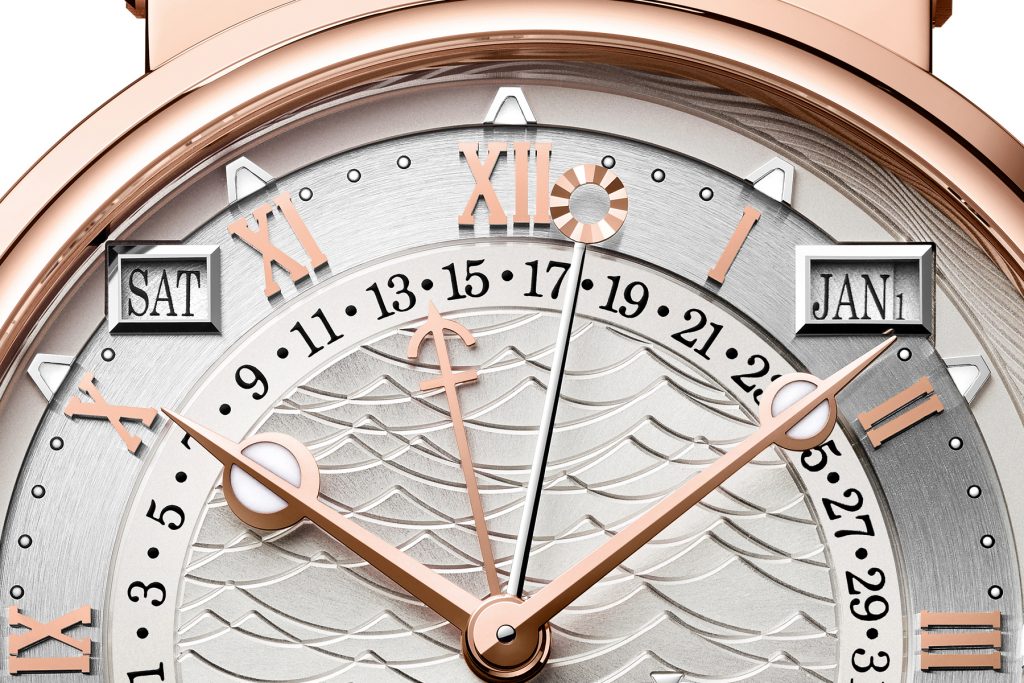 Il nuovo orologio Marine Équation Marchante di Breguet va oltre questo principio indicando contemporaneamente l’ora civile e l’ora reale grazie a due lancette distinte dei minuti. La lancetta solare marciante, decorata con un sole dorato sfaccettato, propone l’indicazione diretta dei minuti del tempo solare, una grande comodità che fa guadagnare tempo. La lancetta dei minuti solari deve infatti rispondere a due imperativi: deve marciare in maniera convenzionale sul quadrante, esattamente come la lancetta dei minuti civili, ma si deve allontanare ogni giorno da quest’ultima di un valore variabile secondo l’analemma per indicare l’equazione del tempo. Breguet ha ottenuto questo risultato dotando la lancetta solare marciante di un ingranaggio differenziale, animato da due fonti di rotazione funzionanti in modo completamente indipendente; la rotazione dei minuti civili e quella controllata dalla leva a contatto con la camma di equazione che, a sua volta, effettua un giro all’anno. Breguet ha sviluppato una camma di equazione estremamente fine, supportata da un disco in zaffiro trasparente, che serve anche per la correzione dell’equazione del tempo mensile.