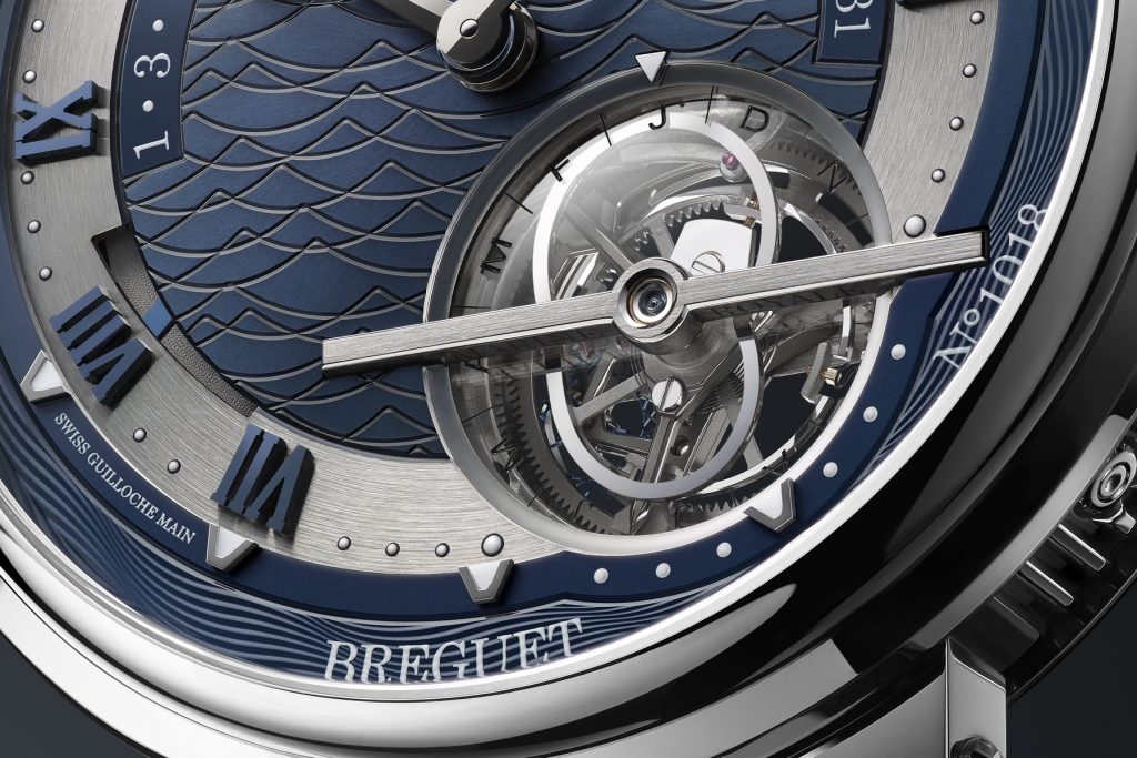 L’ingegnosità di questo orologio viene sottolineata dalle capacità degli artigiani Breguet. Sul lato quadrante presenta due tipi di guillochage, di cui uno con motivo a «onde», concepito espressamente per questa nuova creazione. La menzione «Marine Royale», incisa sulla barretta del tourbillon, attira immancabilmente l’attenzione. Sul dorso dell’orologio i ponti, visibili attraverso un fondocassa in vetro zaffiro, sono stati cesellati per rappresentare nei minimi dettagli il «Royal Louis», vascello di primo rango della Marina Reale Francese. Il bariletto è decorato con una rosa dei venti, facente riferimento alla navigazione astronomica. Grazie al sapiente posizionamento della massa oscillante perifericamente al calibro, il movimento automatica decorato si mostra in tutto il suo splendore.