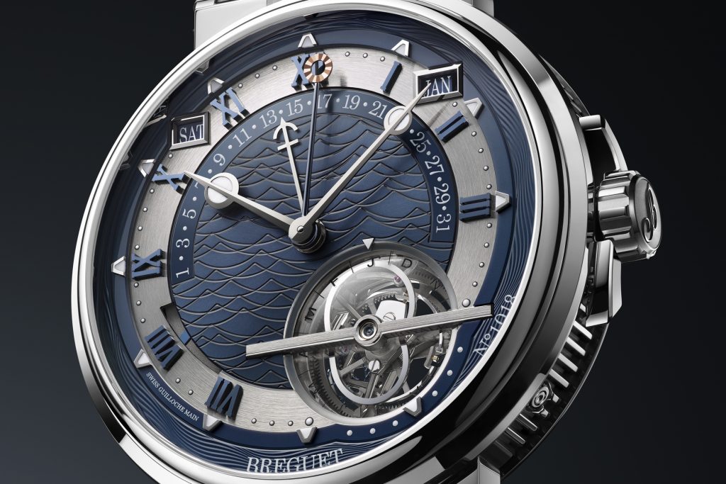 Il nuovo Marine Équation Marchante di Breguet sfoggia nuovi codici estetici che gli conferiscono un aspetto moderno e dinamico: dalle corna centrali che con superfici lucidate e satinate, a delle scanalature più aperte, visibili sui fianchi, una corona sormontata da una «B» lucida su fondo sabbiato, così come la decorazione della corona a forma di onde angolate e satinate. Questo modello Grande Complication viene presentato in una cassa di 43,9 mm in oro rosa o platino. La versione in oro rosa presenta con un quadrante argentato e un movimento antracite, mentre quella in platino ha il quadrante blu e il movimento rodiato.