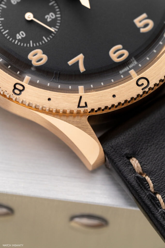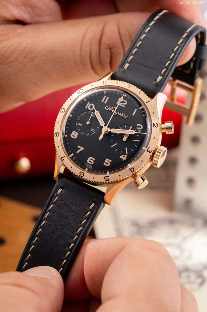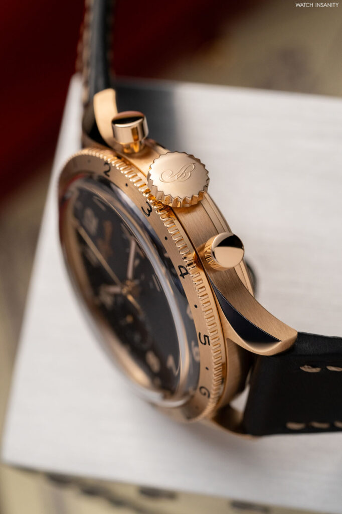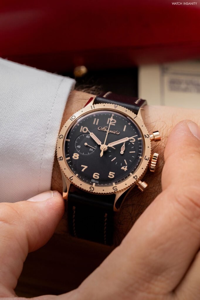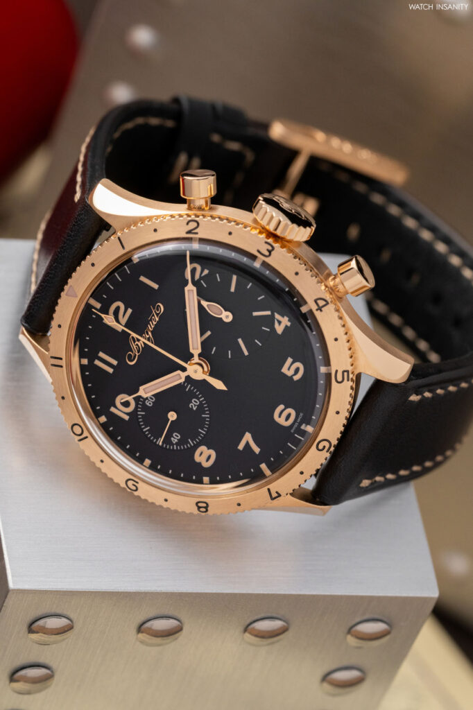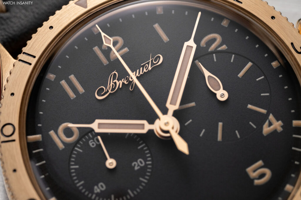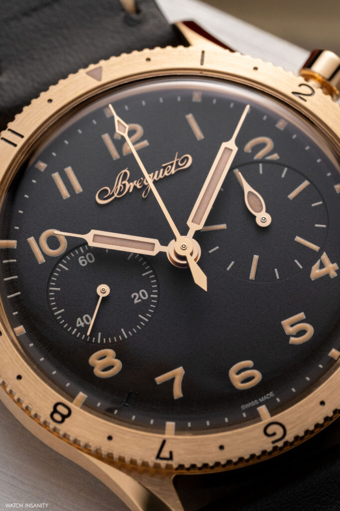 Questi due nuovi orologi sono caratterizzati da casse più piccole rispetto a quelle dei predecessori. Parliamo di un diametro di 38,3 mm e di uno spessore di 13,2 mm. Il diametro non è casuale, poiché sia tratta della stessa dimensione di cassa che aveva il Type XX del 1955, da cui tutto iniziò. Ciò che differenzia questi cronografi è il materiale della cassa, che è l’oro Breguet. Lo abbiamo già visto nel Classique Souscription 2025 ed è una lega da 18 carati composta al 75% da oro, arricchito con argento, rame e palladio. La particolare ed esclusiva composizione, concepita e sviluppata da Breguet, dona alla lega un particolare riflesso biondo. Oltre alla cassa, è in oro Breguet anche la sottile lunetta girevole bidirezionale, che è arricchita da numeri neri incisi.