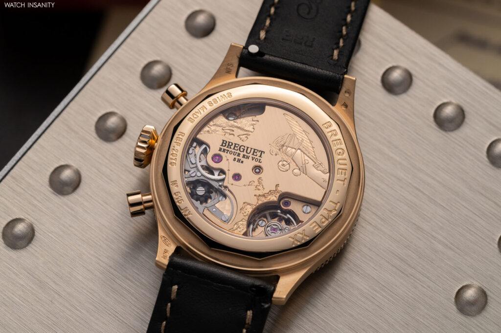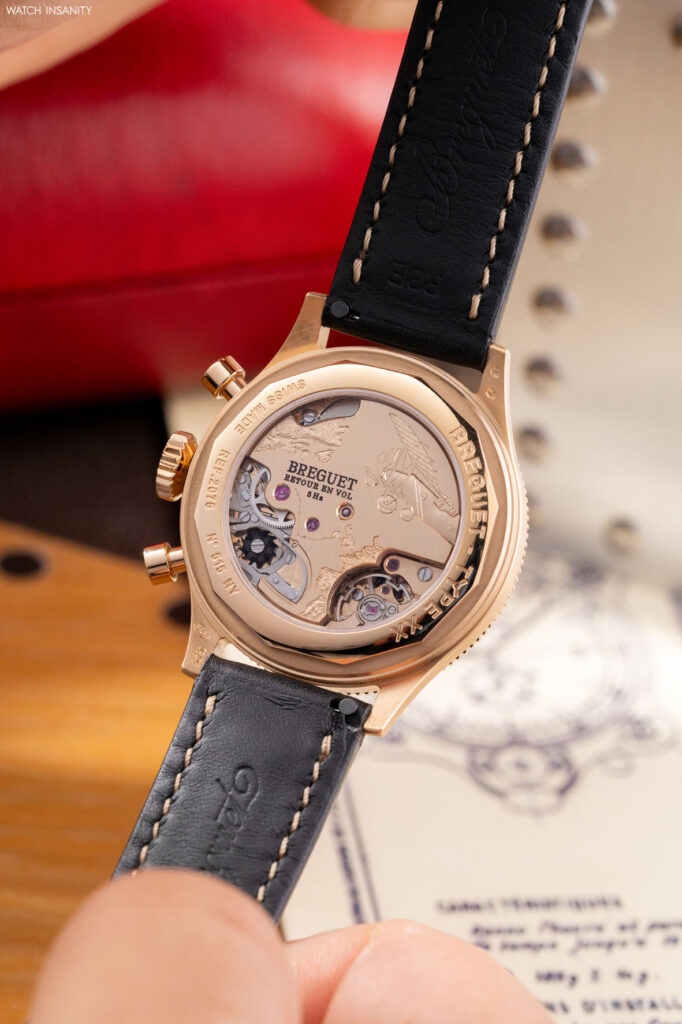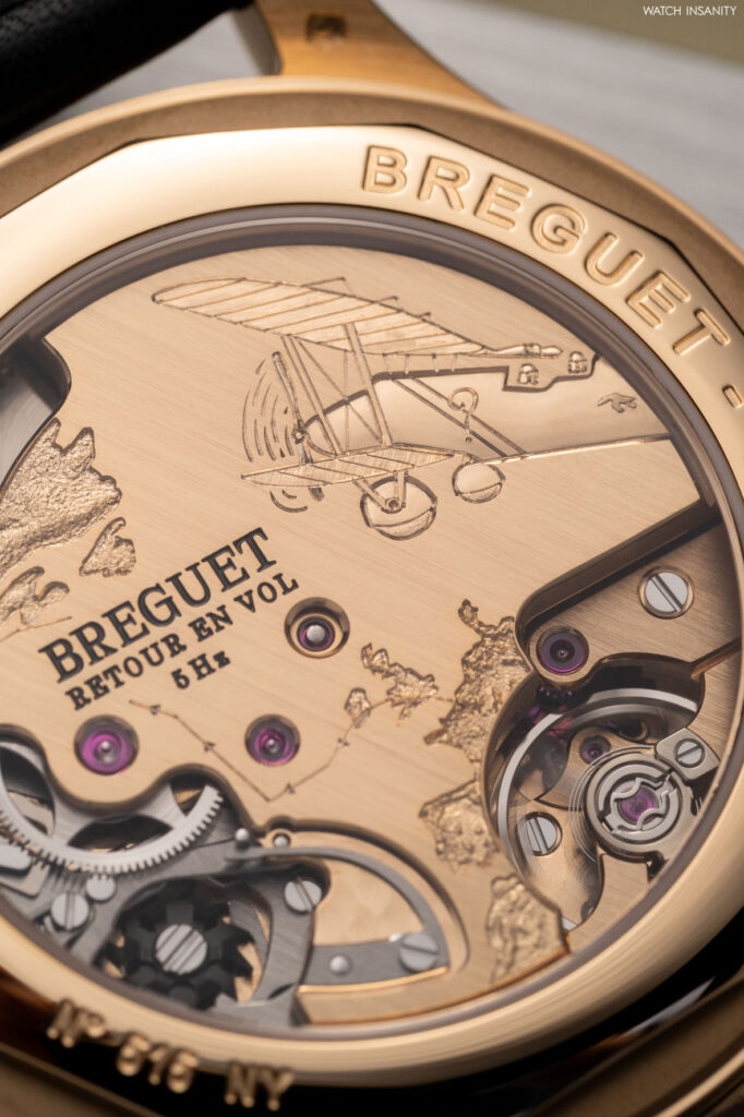 Come in altri pregevoli orologi di Breguet, oltre all’eccellenza meccanica anche il ponte è un’opera d’arte. È inciso a mano e chi, come noi, ha visitato la manifattura, sa che chi lo esegue è davvero un artista. Riproduce l’aereo Breguet 19 che nel 1930, pilotato da Dieudonné Costes e Maurice Bellonte, effettuò la prima trasvolata atlantica da Parigi a New York. Il tracciato della rotta seguita e il profilo delle coste europee e nordamericane sono anch’essi incisi sul movimento.