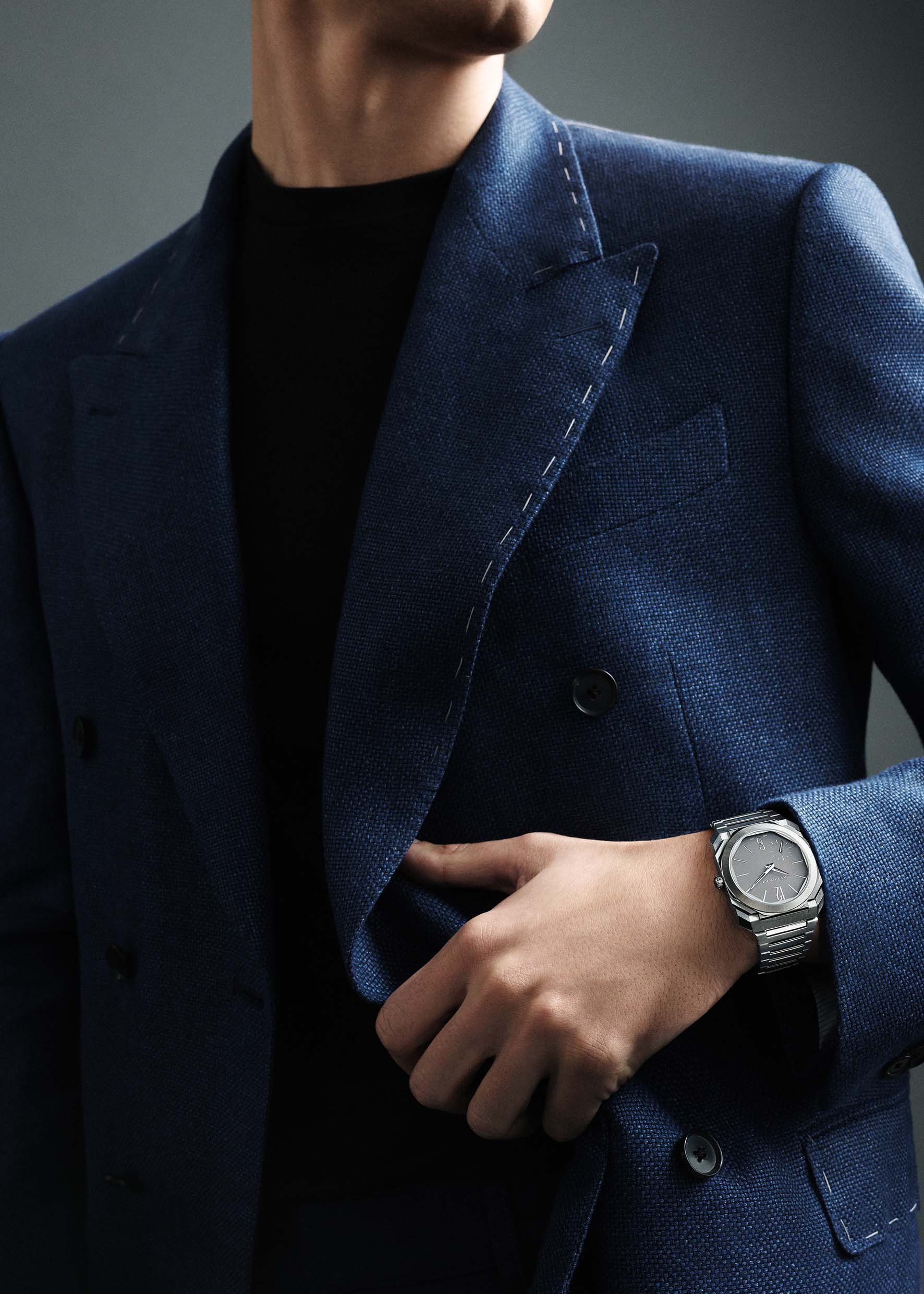 La versione in titanio satinato-lucido introduce un’interpretazione più dinamica dell’architettura Octo, in cui il dialogo tra superfici satinate e lucidate evidenzia con precisione gli spigoli e la complessità della cassa. Il risultato è una lettura più grafica e definita della struttura, senza alterarne l’equilibrio complessivo. Il quadrante in titanio opalino abbinato a indici e sfere rodiati mantiene una coerenza cromatica controllata, mentre il bracciale integrato, costruito con la stessa alternanza di finiture, rafforza la continuità visiva dell’insieme. Il prezzo è fissato a 18.500 euro, riflettendo la complessità delle lavorazioni e del trattamento delle superfici.