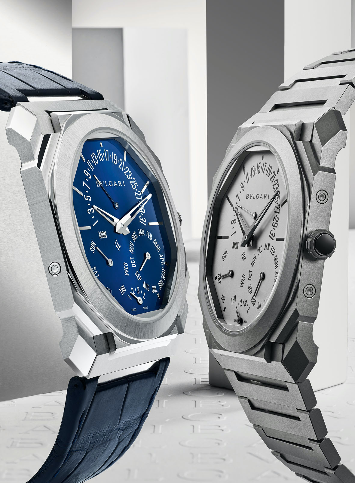 In pochissimo tempo, Octo Finissimo ha lasciato il segno nel panorama dell’alta orologeria. Dopo aver intrapreso l’estrema miniaturizzazione nei campi del movimento automatico, della ripetizione minuti, del cronografo e del tourbillon, Bvlgari presenta l’orologio Octo Finissimo Perpetual Calendar, il più sottile al mondo. Questo nuovo modello da record è disponibile in due varianti: una con l’iconica veste in titanio, come tutti gli orologi di Bvlgari che hanno guadagnato record mondiali, e una in platino.
