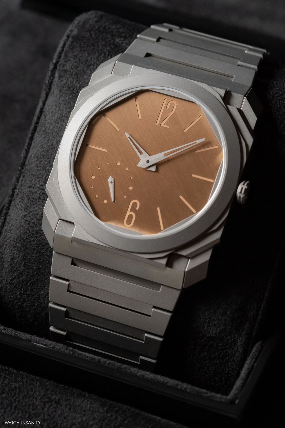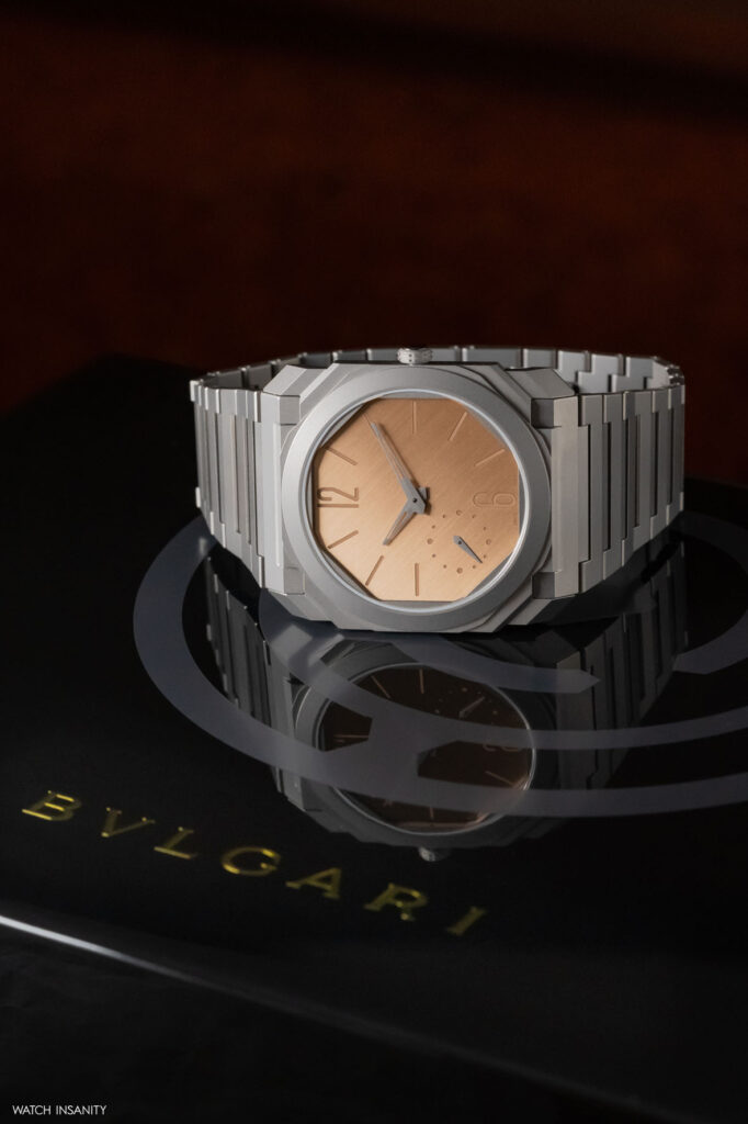 Per quanto riguarda gli altri dettagli tecnici, la cassa ha il classico diametro di 40 mm e spessore di 5 mm dell’Octo Finissimo, impermeabile fino a 3 bar. È in titanio sabbiato così come il bracciale con chiusura deployante e la corona, che ha un inserto in ceramica nera.