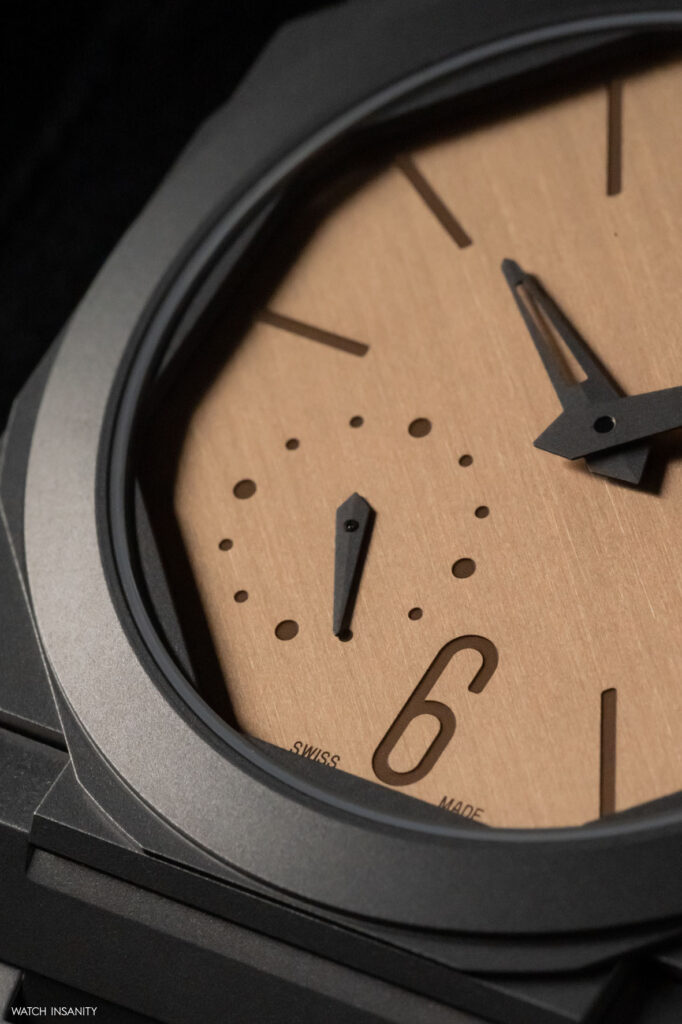 Che cosa lega, dunque, l’Octo Finissimo per Pisa Orologeria all’azienda di via Verri e alla storia di Milano? Principalmente il quadrante. È in bronzo, con una finitura satinata grezza, e il suo colore richiama da vicino quello del logo di Pisa Orologeria; gli indici incisi a laser e la lavorazione del bronzo danno l’impressione d qualcosa di non rifinito, come se fosse appena stato sbozzato da un fabbro. Un understatement incredibile che rende l’orologio super elegante.