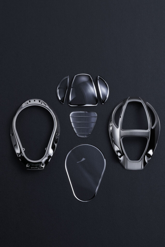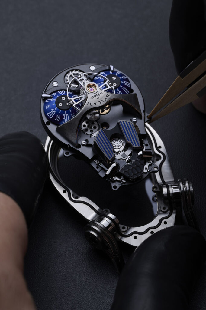 La cassa ospita un movimento altrettanto complesso, progettato e sviluppato internamente da MB&F. Fin dall’inizio, una delle idee principali di Fabrizio era infondere vita (meccanica) al Serpenti, animandone gli occhi. Questo concetto si è tradotto in due cupole rotanti per l’indicazione delle ore e dei minuti: quella di sinistra compie una rotazione completa in 12 ore, mentre quella di destra in 60 minuti. Le cupole, sottilissime, sono realizzate in alluminio massiccio per massimizzarne la leggerezza, grazie a innovativi processi di fresatura. Entrambe sono decorate con Super-LumiNova applicato a mano, che consente allo sguardo luminoso del serpente di persistere anche nell’oscurità.