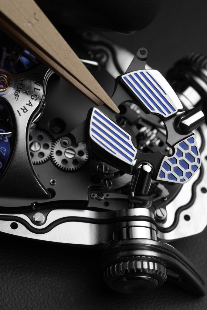 Il cervello meccanico del rettile è simboleggiato dal bilanciere volante di 14 mm, sovradimensionato e tecnicamente complesso, dotato di quattro viti di regolazione tradizionali e pulsante alla classica frequenza di 18.000 alternanze all’ora. È saldamente fissato da un ponte del bilanciere tridimensionale, su cui sono riportati i nomi dei due partner. La carica e l’impostazione dell’ora sono controllate da corone separate, integrate nelle anse posteriori del Bvlgari x MB&F Serpenti.