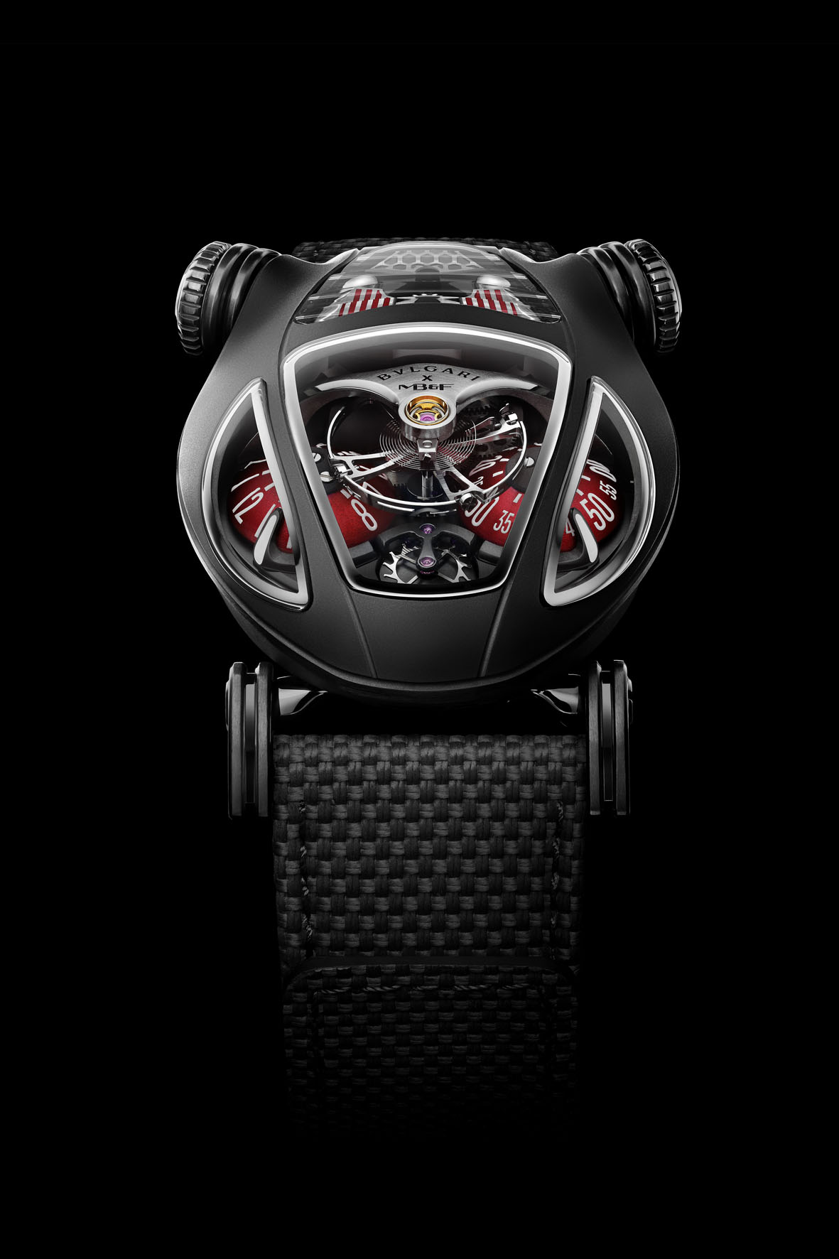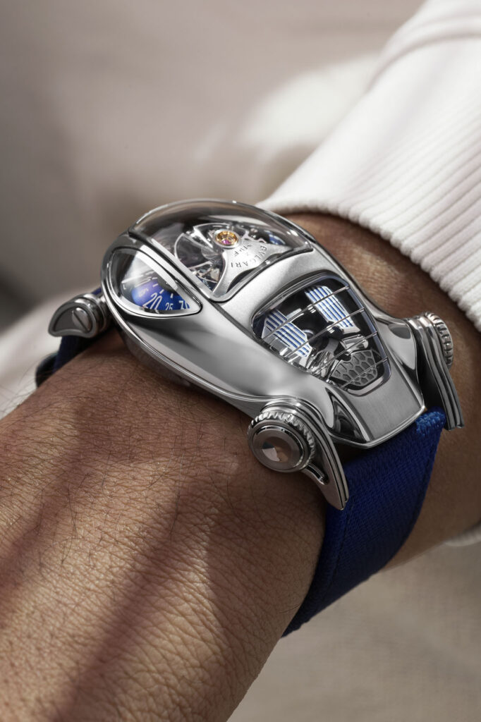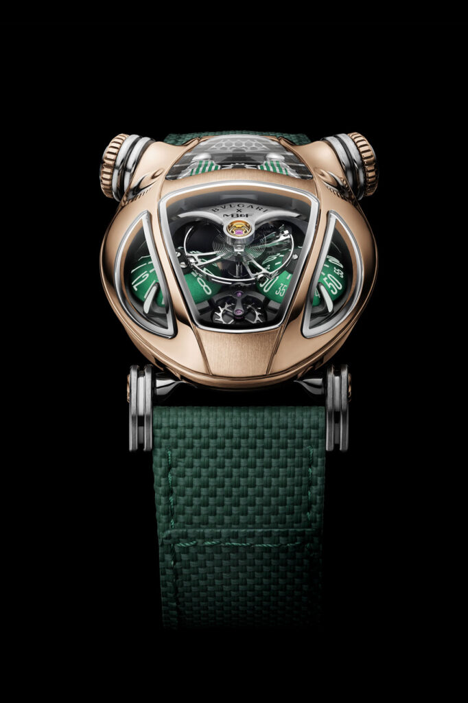 Oltre alle chiare origini del Serpenti, i suoi due creatori hanno tratto ispirazione da un’altra fonte per dar vita a questa nuova serie esclusiva. Fabrizio e Max condividono una passione per il design automobilistico e sono cresciuti con gli stessi riferimenti nel mondo delle auto. All’inizio, l’integrazione di codici di design automobilistico nel Bvlgari x MB&F Serpenti non era prevista, ma l’influenza di questo mondo si è fatta inevitabilmente strada nella nuova creazione: una cassa che evoca l’elegante carrozzeria di un’auto, un vetro zaffiro “scalato” che richiama le alette sul lunotto posteriore di un’auto sportiva, corone che potrebbero facilmente essere confuse con ruote automobilistiche… Anche la parte visibile del movimento include elementi che richiamano i motori automobilistici, tra cui una griglia con il celebre motivo a squame esagonali, già presente nelle precedenti creazioni Serpenti.