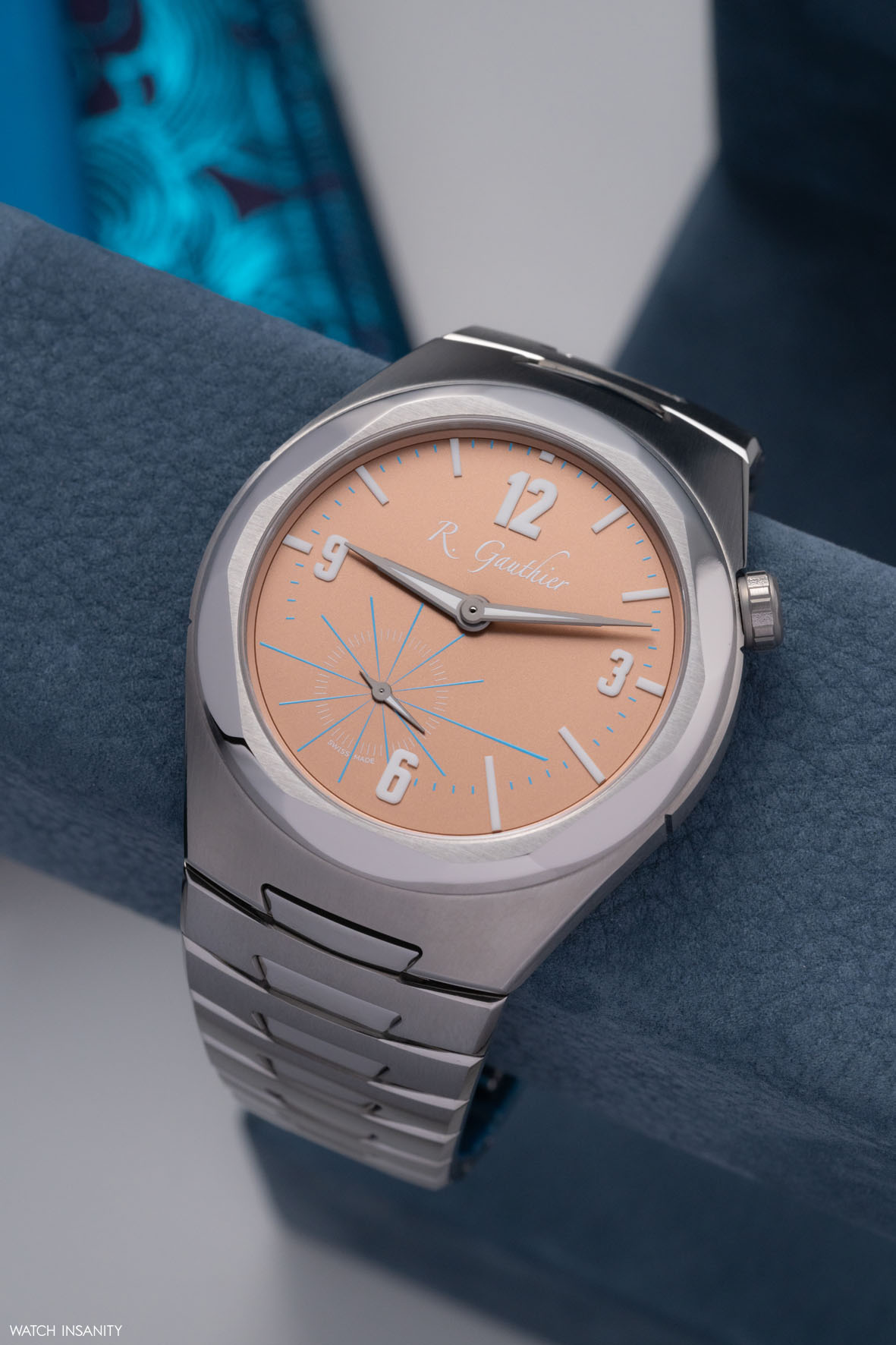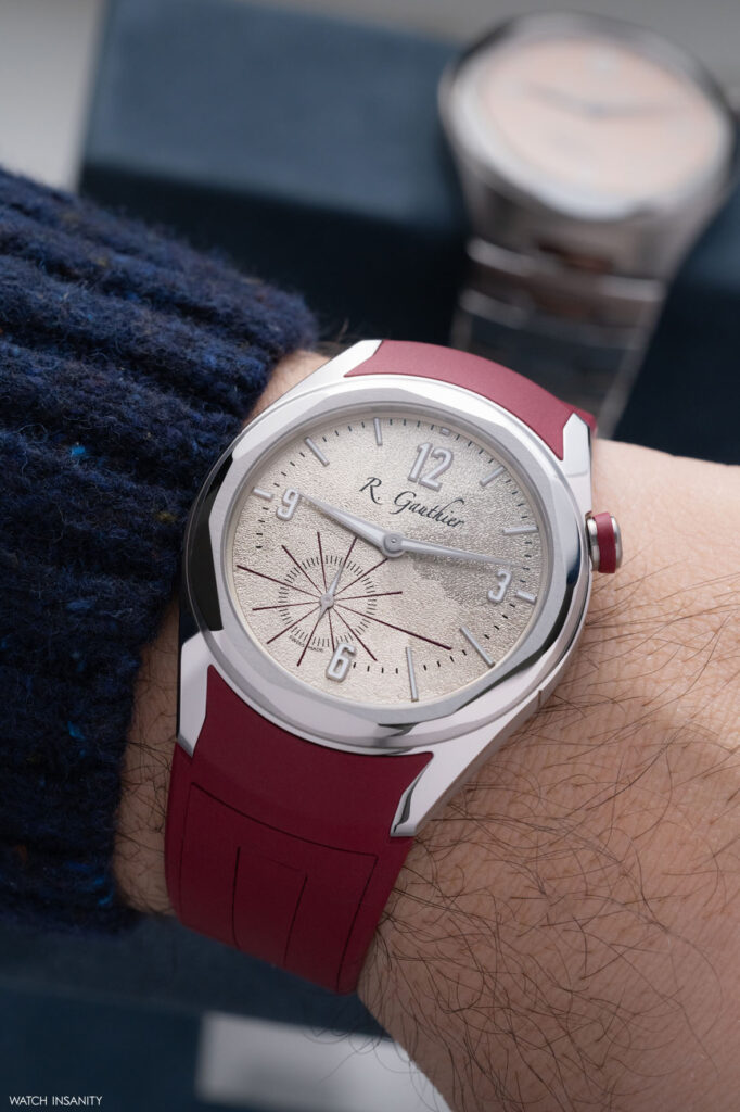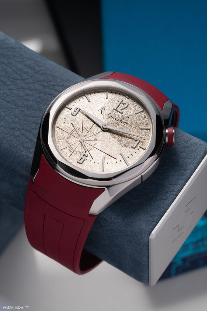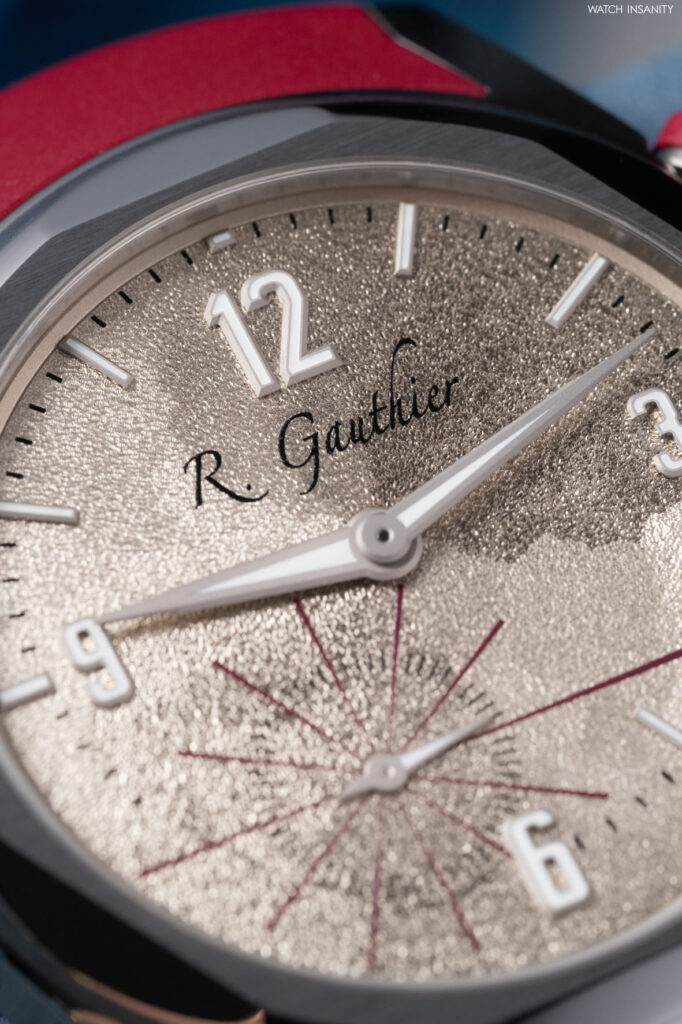 Le sorprese non mancano neppure sul quadrante: l’osservatore più attendo, infatti, non può non notare che le lancette delle ore e dei minuti sono decentrate sull’asse orizzontale e che gli indici delle ore si assottigliano leggermente e presentano una lunghezza variabile, mentre gli intervalli di 5 secondi dei piccoli secondi a ore 7 sono anch’essi contrassegnati da linee affusolate di lunghezza diversa. Gauthier ha spiegato questo gioco di prospettiva affermando che “Piuttosto che una serie di cerchi chiusi, come spesso si vede in orologeria, ho voluto un quadrante aperto, arioso, sul quale le linee ortogonali complete o parziali formano punti di fuga con gli assi delle lancette, rafforzando la nozione di continuità”.