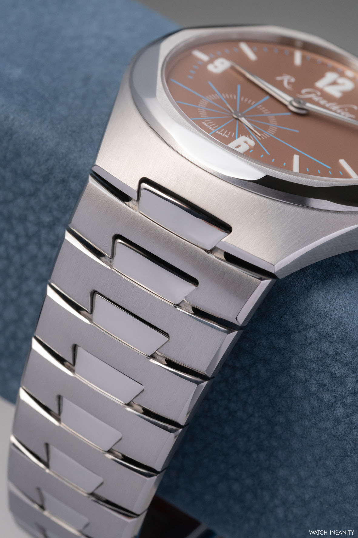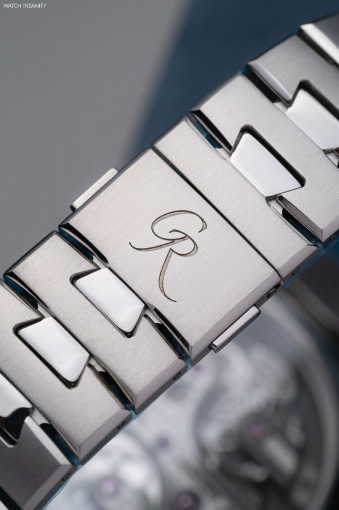 Tra la lunetta e il fondello, la cassa monoblocco e le anse sono scolpite geometricamente, alternando finiture lucide e satinate a scanalature estetiche abilmente realizzate per far risaltare le forme.