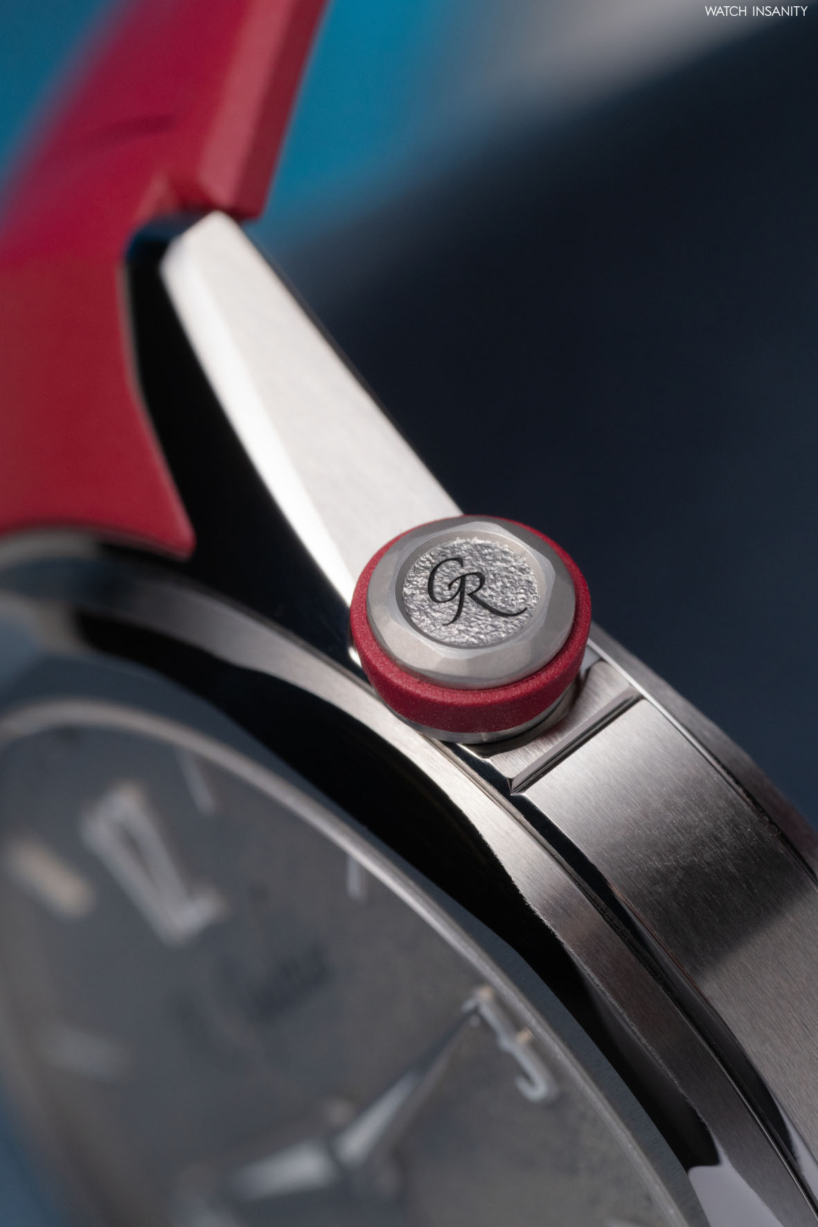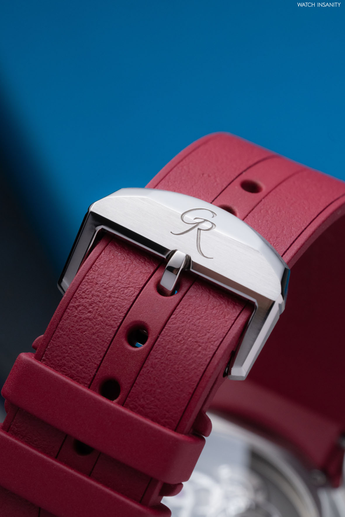 Il cinturino in caucciù con fibbia ad ardiglione segue la forma delle anse angolari e della fascia arrotondata della cassa in modo da apparire come un’estensione continua e organica della cassa (per il collezionista che non ama i cinturini è presente anche la versione braccialata). La corona per la carica e la regolazione dell’ora è posizionata ad ore 2: ciò consente di liberare spazio per il movimento del polso.