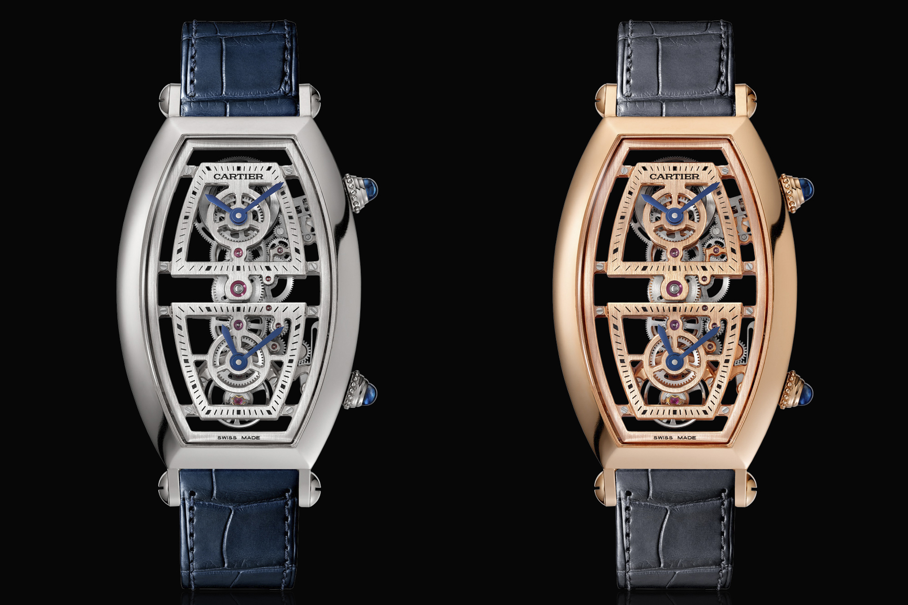 Quest’anno Cartier celebra una forma leggendaria con un modello ore e minuti ridisegnato e un modello doppio fuso orario scheletrato.