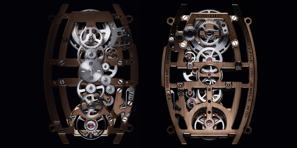La volontà di mantenere la forma originale ha comportato la realizzazione di due prodezze tecniche. Innanzitutto, i rotismi sono stati allineati tra le ore 12 e le ore 6 per rispettare la forma allungata dell’orologio. In secondo luogo, per adattarsi alla cassa incurvata dell’orologio Tonneau, il movimento ha subito una modifica strutturale, essendo anch’esso incurvato. Il rotismo presenta un taglio inclinato sul bariletto e sul componente mobile dello scappamento, rispondendo così all’esigenza di confort e di ergonomia. Infine, frutto di un’accurata ricerca estetica, i due fusi sono stati collegati dando vita a uno spettacolo che associa l’utile al dilettevole: lettura dell’ora agevolata sui ponti della scheletratura e regolazione del secondo fuso orario mediante pressione sulla corona a ore 4 e salti di un’ora.