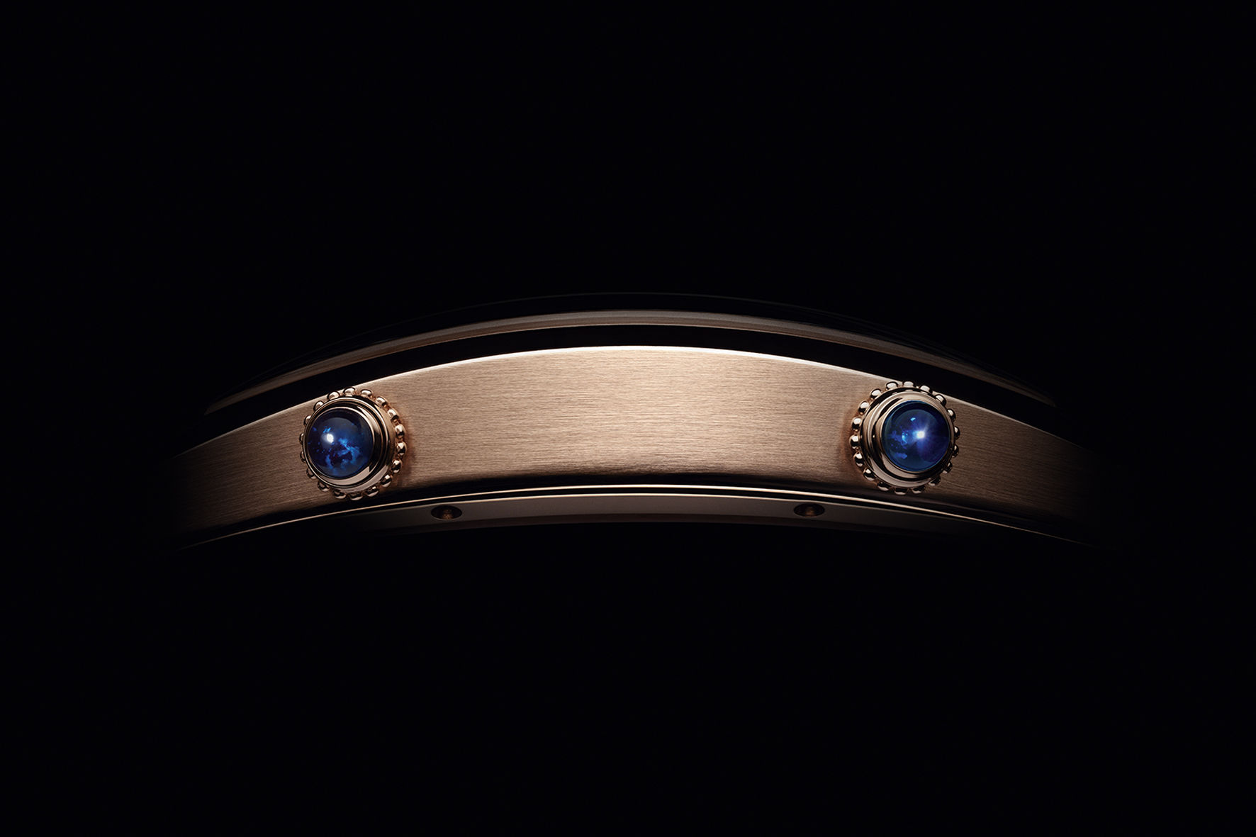Su questo modello, il volume della lunetta è lavorato a partire da uno stesso blocco, senza decentramento né interruzioni. Profilo e attacchi si integrano perfettamente nelle linee della cassa. I numeri lucidati e rodiati si stagliano sullo sfondo del quadrante, champagne per la versione in oro rosa, argentato per quella in platino.