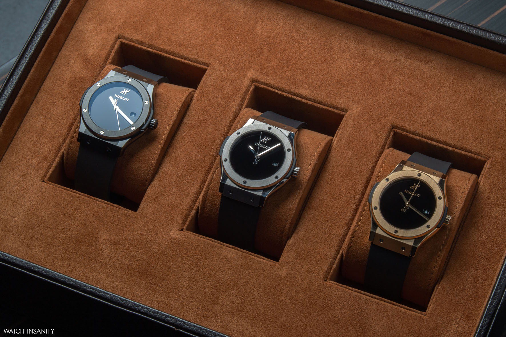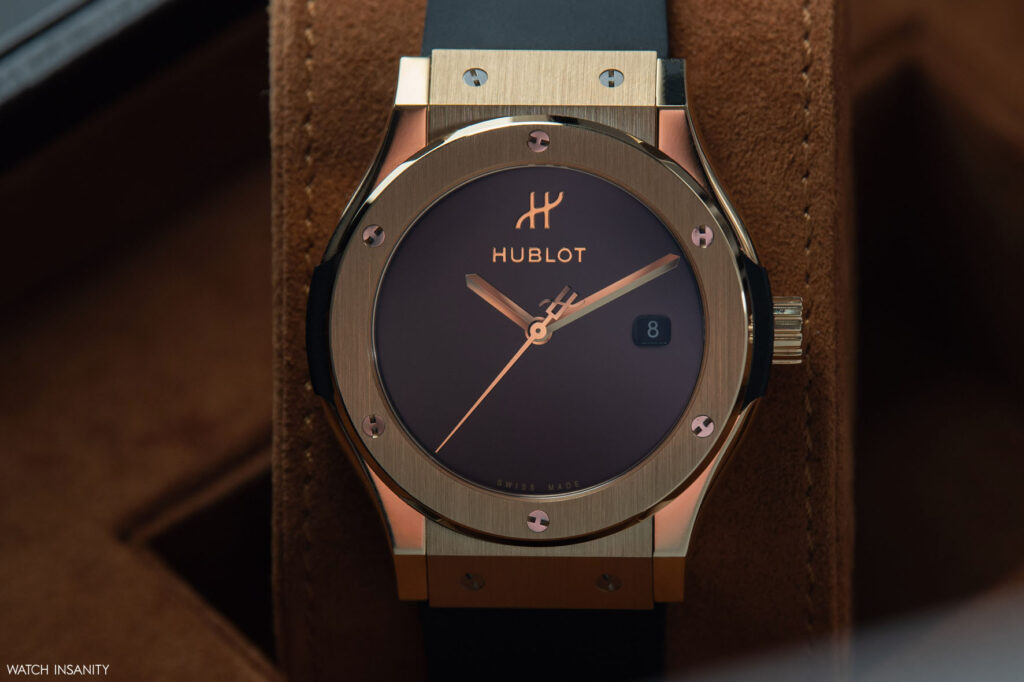 Lo stesso quadrante si ritrova nelle referenze con cassa da 38 e 42 mm, che ospitano però il movimento di manifattura automatico MHUB1110. È un calibro da 28.800 alternanze/ora e 42 ore di riserva di carica, elaborato da Hublot sulla base del Sellita SW300-1 a, una garanzia in quanto ad affidabilità, durata e precisione.