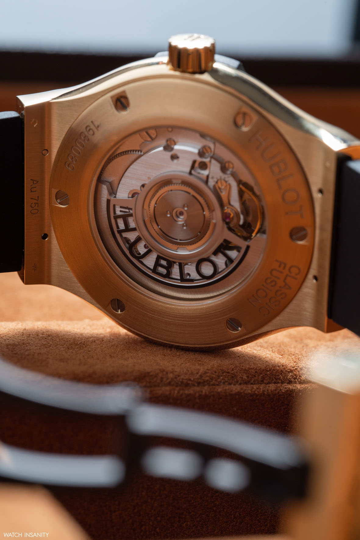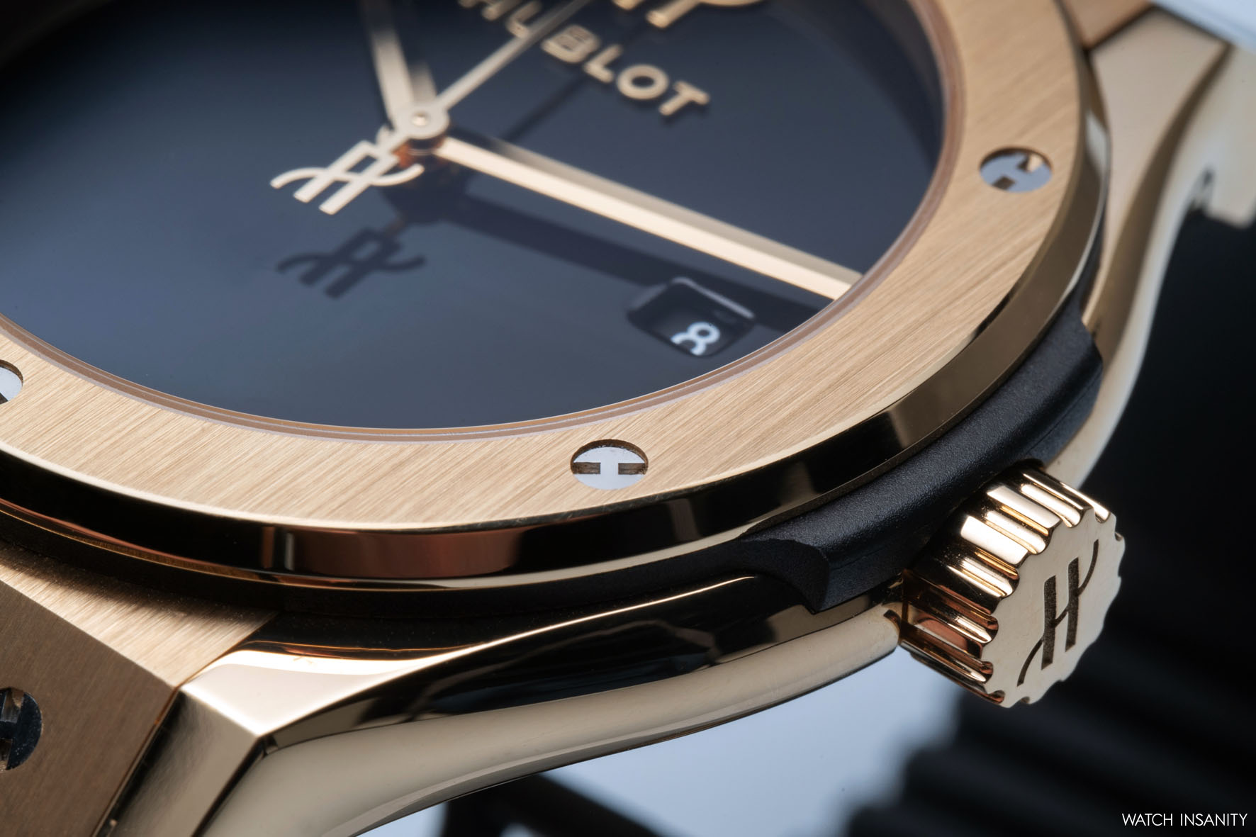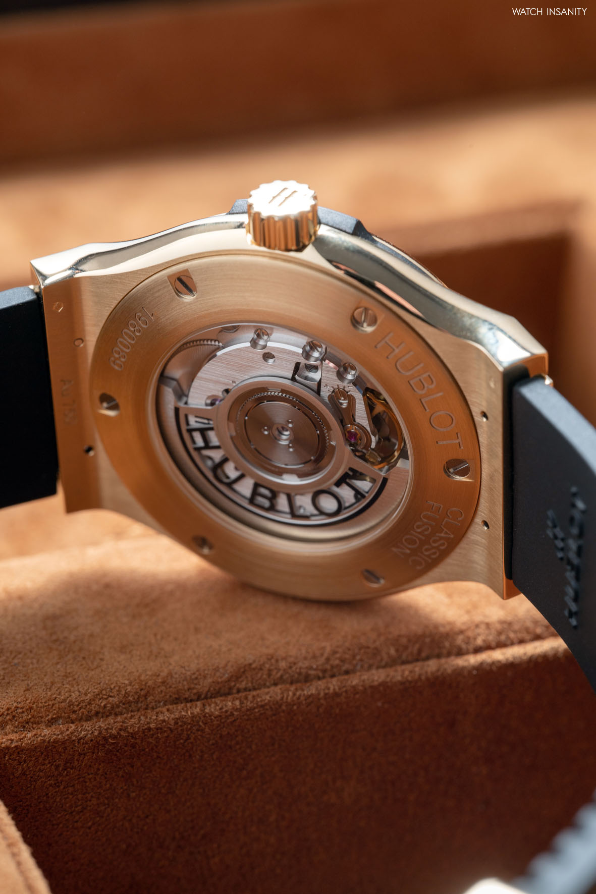 Due parole anche sul cinturino, che nel caso del Classic Fusion Original ha l’importanza storica che tutti ben conosciamo. Hublot ha scelto di farlo liscio, nonostante buona parte dei cinturini nel suo assortimento siano striati. Il motivo della scelta è evidente, dato che il cinturino del Classic Original degli anni ’80 era liscio…