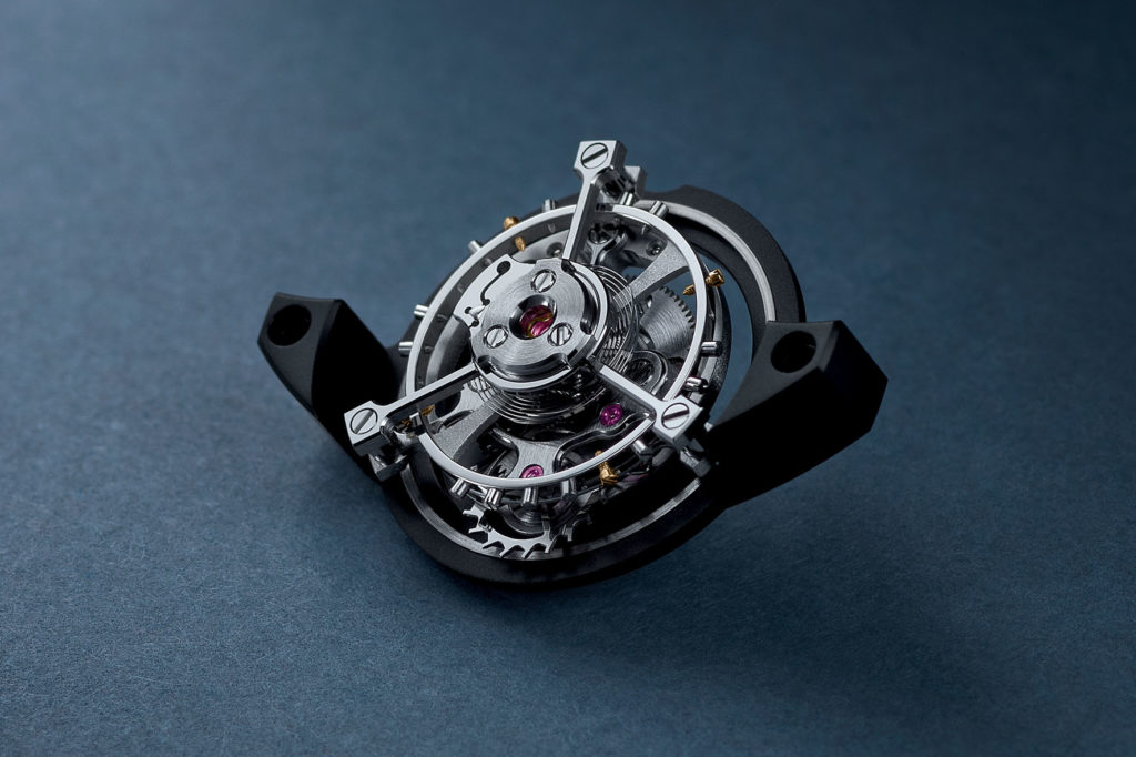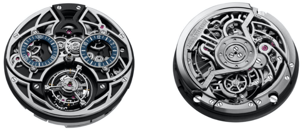 Al di sotto del complesso vetro zaffiro a doppia curvatura, i contatori trasparenti del cronografo a ore 3 e a ore 9 rivelano parte del complesso meccanismo, mentre il flying tourbillon effettua la propria rotazione a ore 6. La lunetta interna laccata blu, le lancette in oro bianco e gli anelli del cronografo aggiungono un tocco di colore, messo in risalto dal cinturino blu scuro in alligatore.