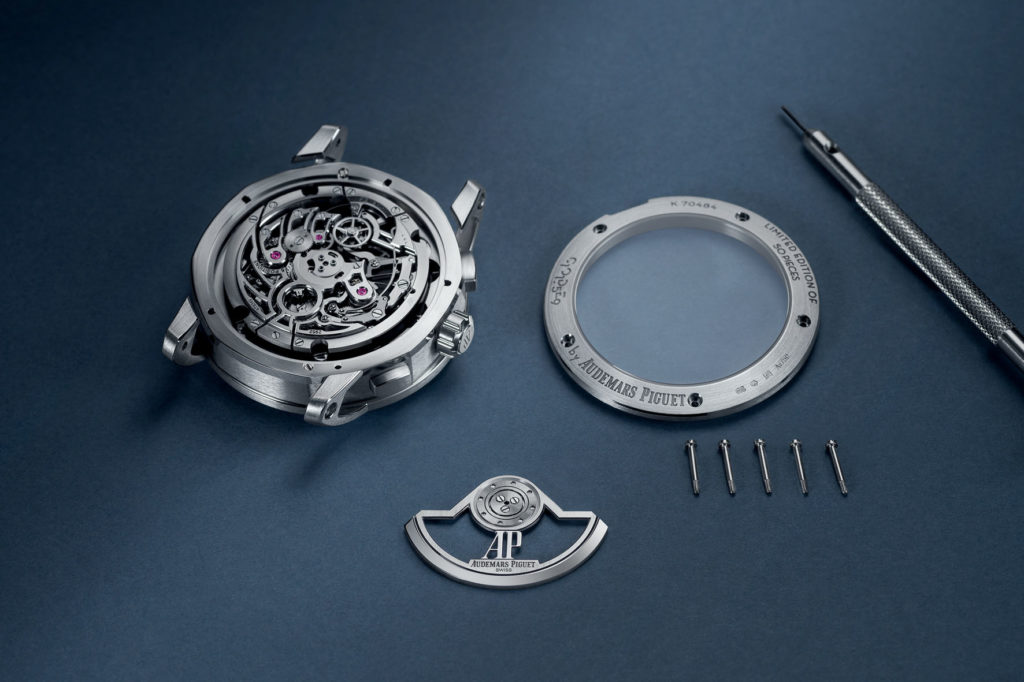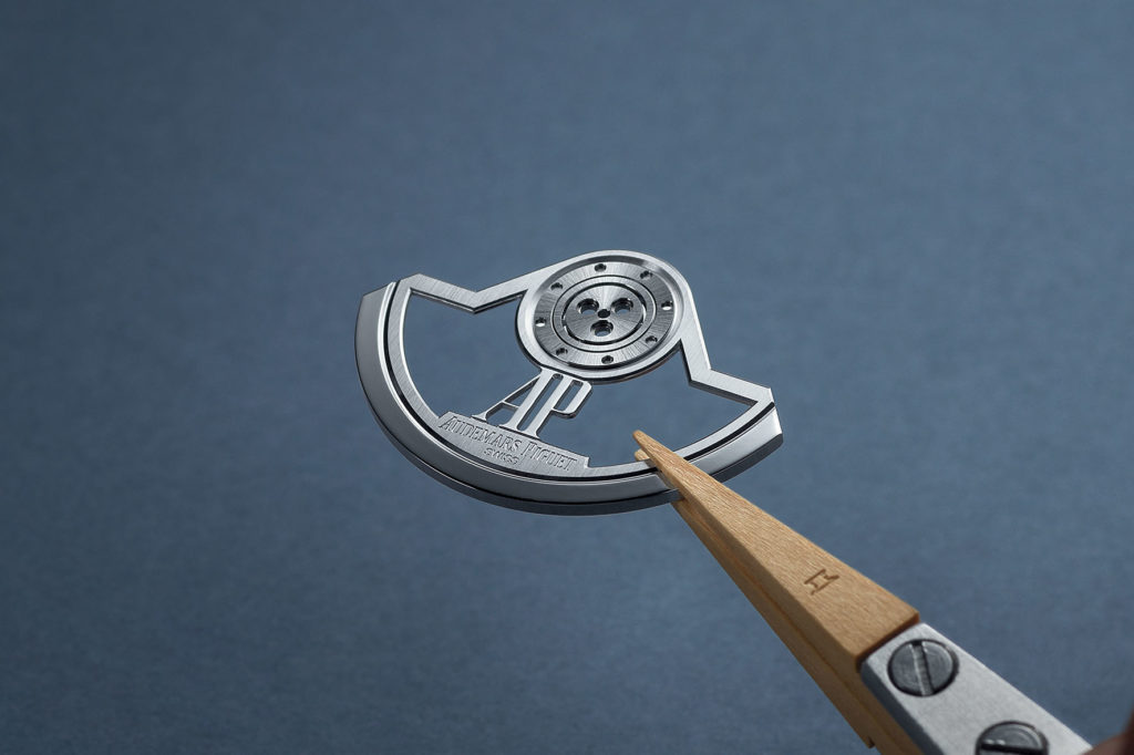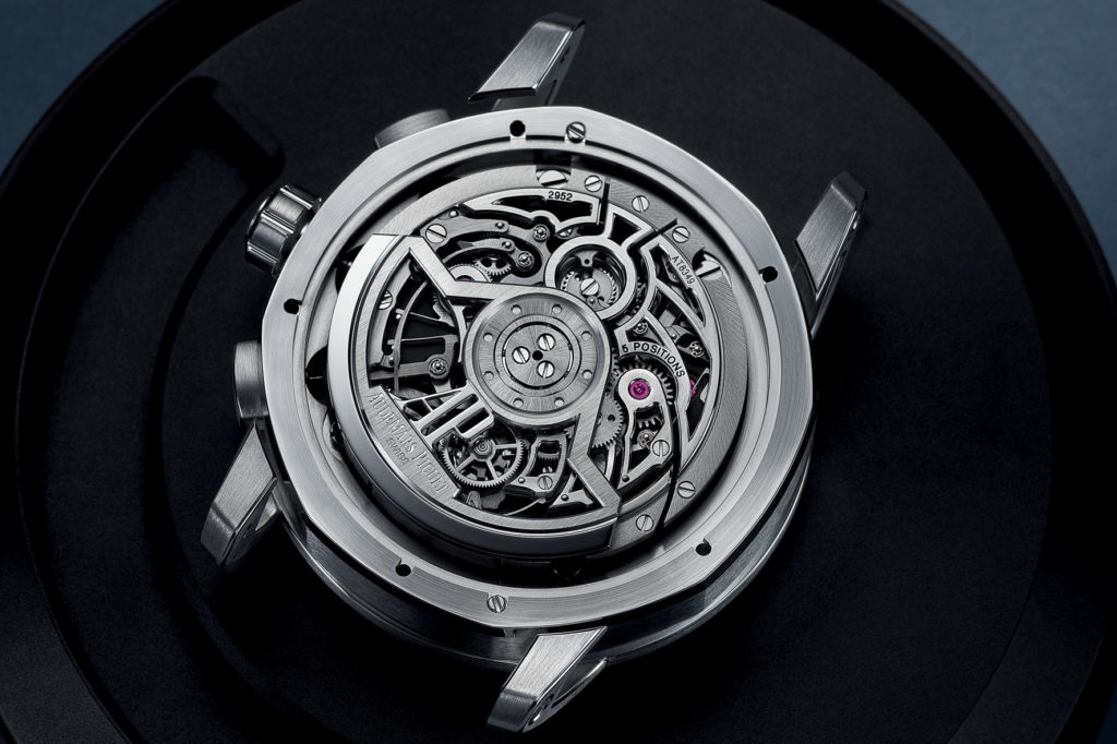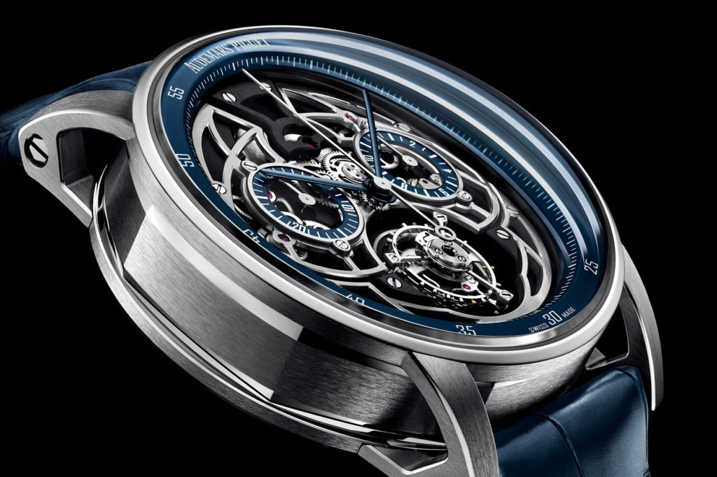 Il nuovo 11.59 by Audemars Piguet Flying Tourbillon Cronografo Automatico unisce una cassa da 41mm in oro bianco 18 carati a un design frontale architettonico tridimensionale che confonde i confini tra quadrante e movimento. Il contrasto tra i ponti scheletrati color rodio e nero galvanico rifiniti in titanio e alpacca dona all’orologio profondità e gioco di luce. Il movimento, così come tutti gli elementi del design, che contano oltre 100 angoli lucidati a mano, sono accuratamente rifiniti a mano con un’alternanza di superfici satinate e sabbiate.